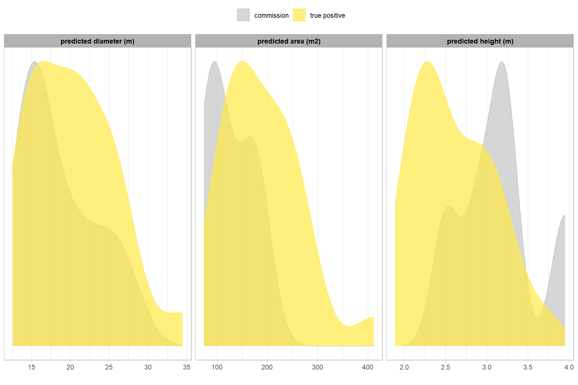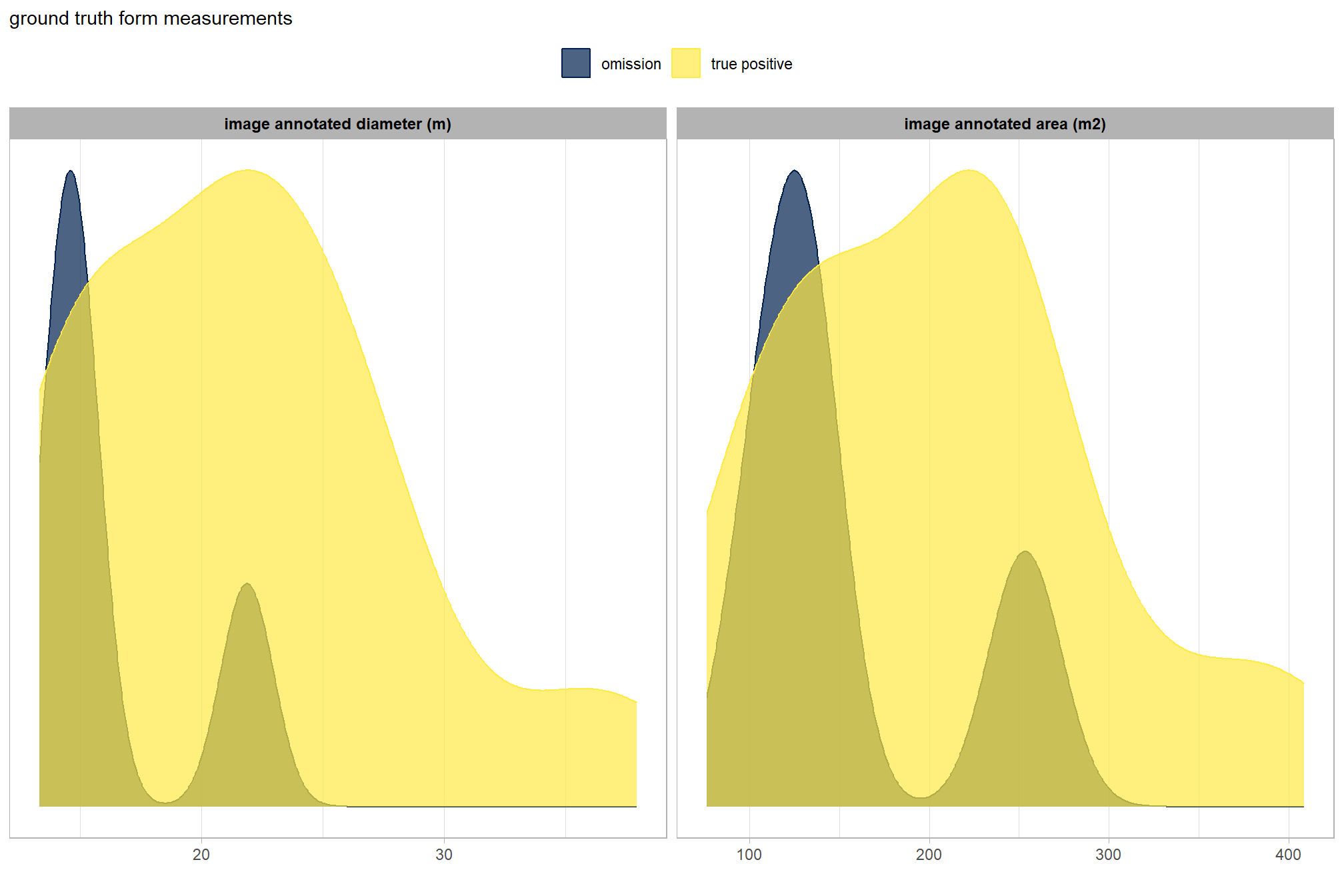before we leave, let’s summarize the measurement values of the predictions (true positive and false positive) and the ground truth data (true positive and false negative) over the entire stand (this is similar to a basal area comparison in a forest inventory)