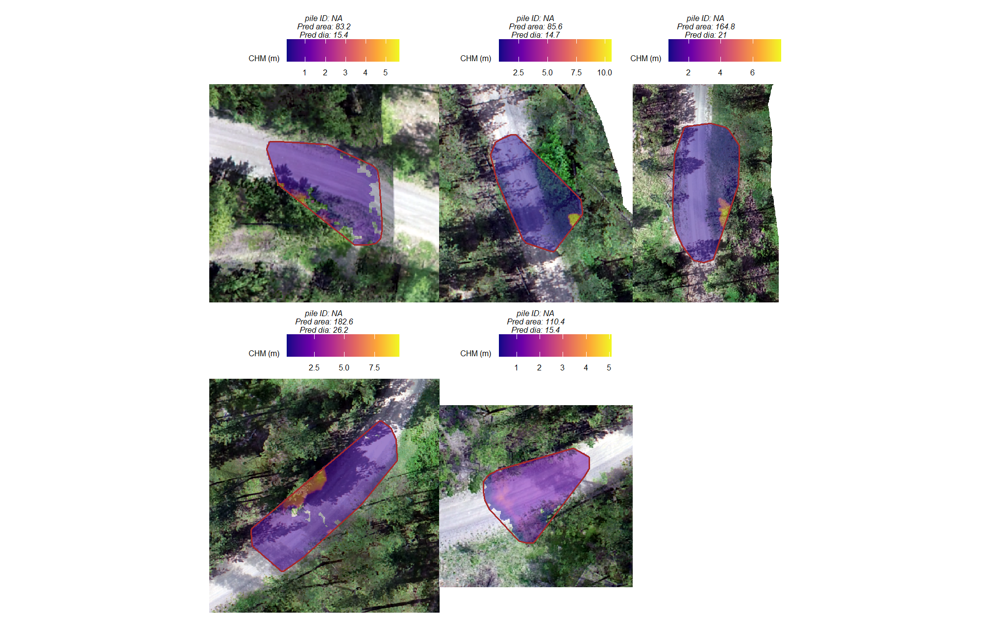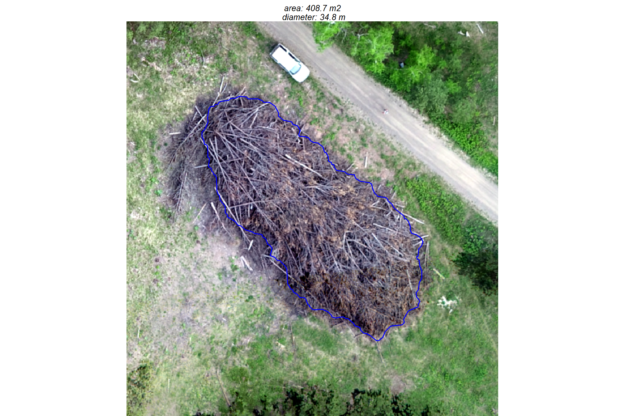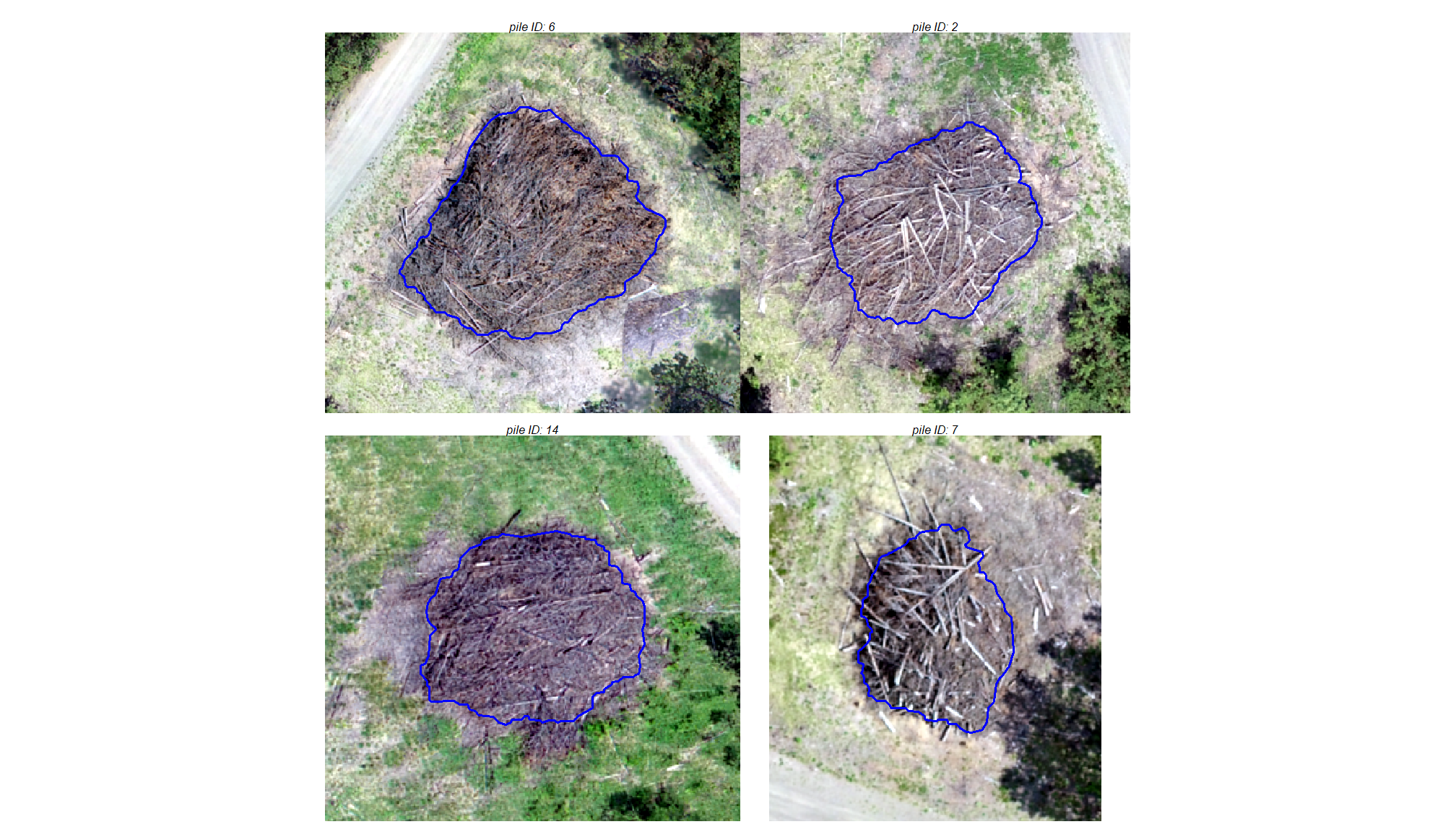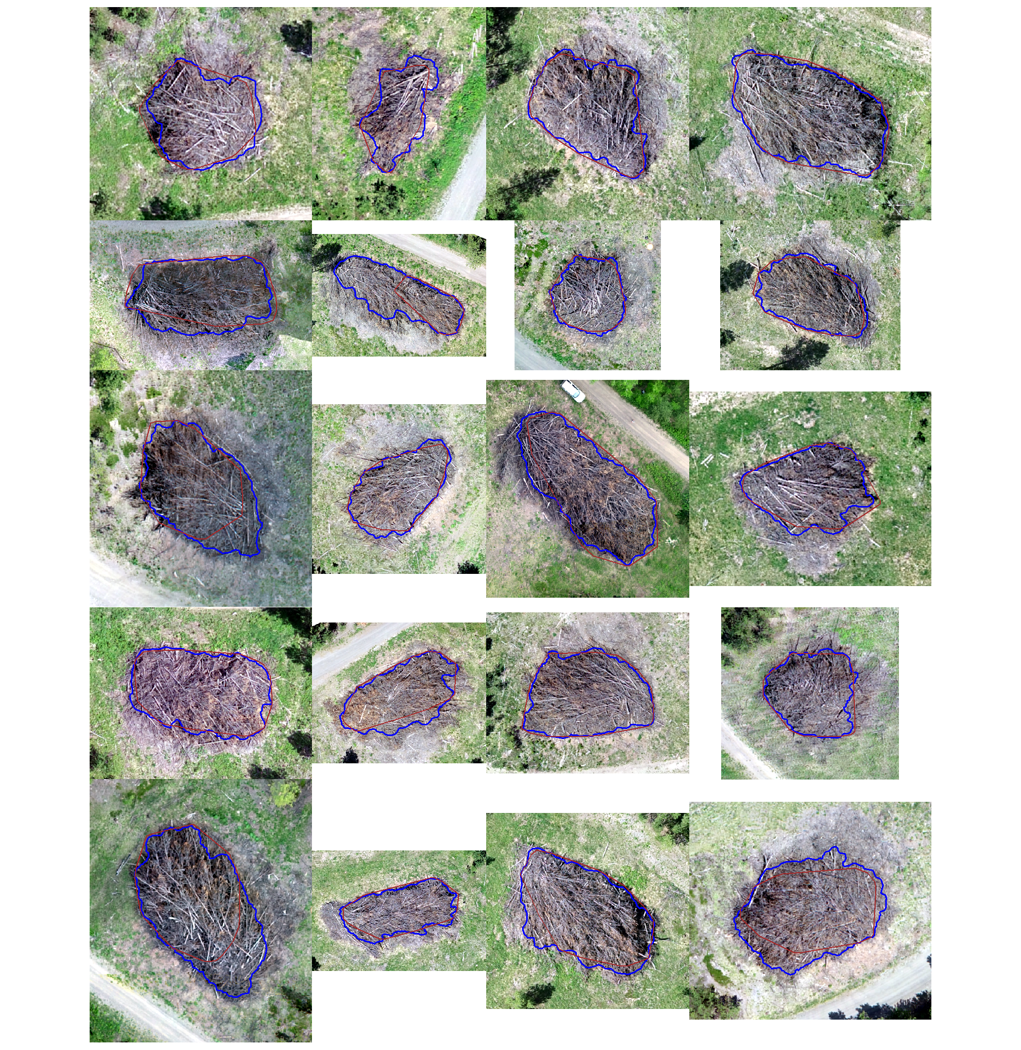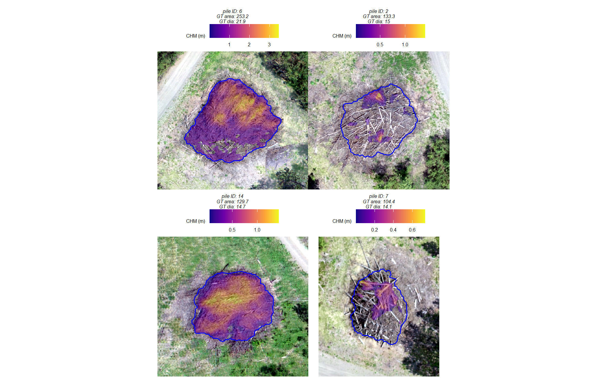 Here, we further validate the methodology against a Ponderosa Pine treatment area with massive machine piles to serve as a critical test of the methodology’s generalizability. While ecologically similar to the training site, this location features a fundamentally different pile construction prescription, resulting in massive machine piles that exhibit a high degree of geometric irregularity, with observed shapes ranging from circular to rectangular perimeters and numerous complex deviations. Given this novel pile construction, the detection parameters will be adjusted from the training site’s optimal settings, relying on the specific treatment prescription and onsite implementation feedback. For this site, parameter adjustments will focus on relaxing the geometric filters (e.g. circle_fit_iou_pct) to accommodate the varied footprints of these machine-built piles while relying on strict size and scale filters (e.g. min_ht_m and min_area_m2) to exclude smaller non-pile objects like shrubs and boulders. As with the Pinyon-Juniper site, image-annotated pile footprints will be used as ground truth data to calculate performance metrics (e.g., F-score and MAPE) to determine how well the methodology generalizes to these large, unprecedented, and structurally complex structures.