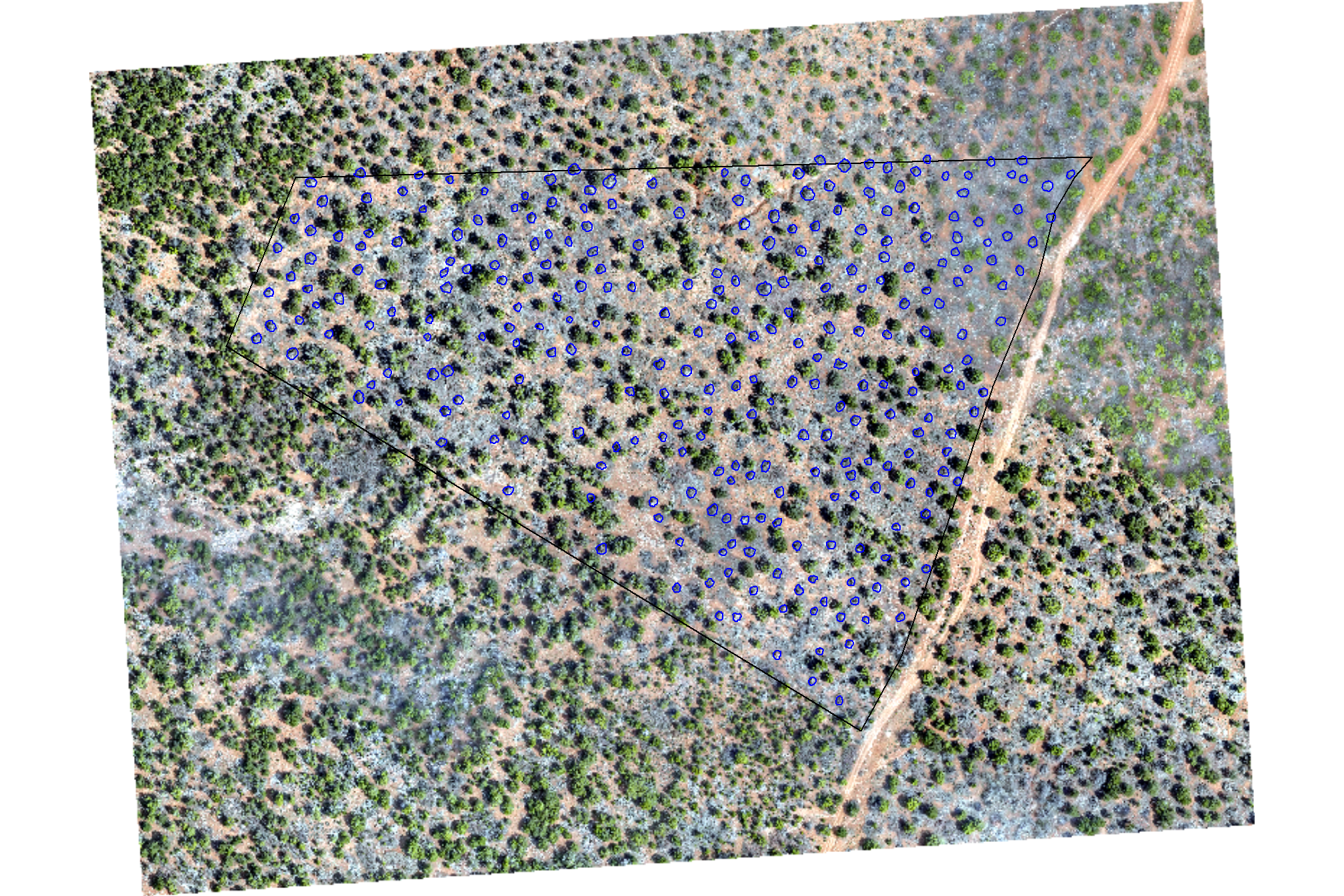 The present section will validate the detection methodology against a Pinyon-Juniper validation site, employing the detection methodology as informed by the best-performing parameterization using the training data. This validation site is ecologically distinct from the Ponderosa Pine training area, featuring typically denser stands composed of smaller trees and an increased shrub presence, creating a more complex background canopy structure. Furthermore, this site exclusively utilized hand-piling for slash treatment, producing smaller piles than the few machine piles in the training data. To effectively assess the method’s transferability, the detection methodology’s parameters will be adjusted from the training site’s optimal settings based on the specific treatment prescription and onsite implementation feedback, mimicking real-world application where site conditions and methods directly influence pile characteristics. Ground truth validation data from the Pinyon-Juniper site will be used to calculate performance metrics (e.g., F-score and MAPE) to determine how well the method generalizes; if the resulting accuracy is acceptable despite these ecological and structural challenges, it would provide compelling evidence that the methodology is transferable across different forest types.