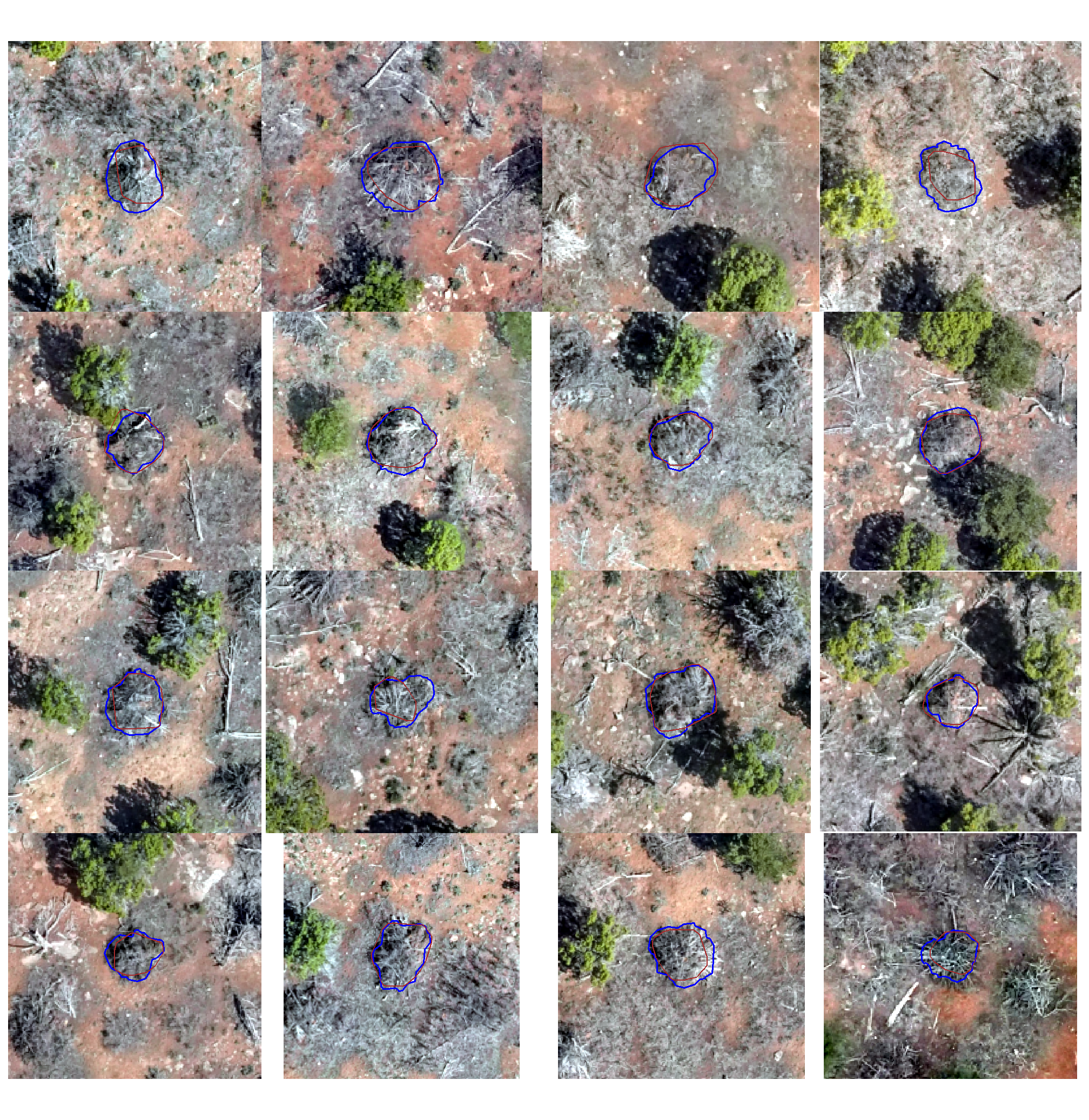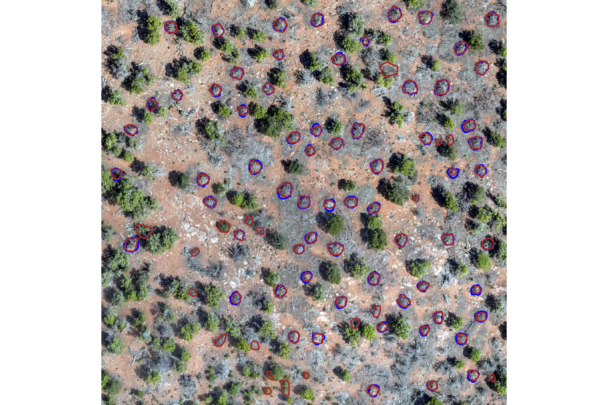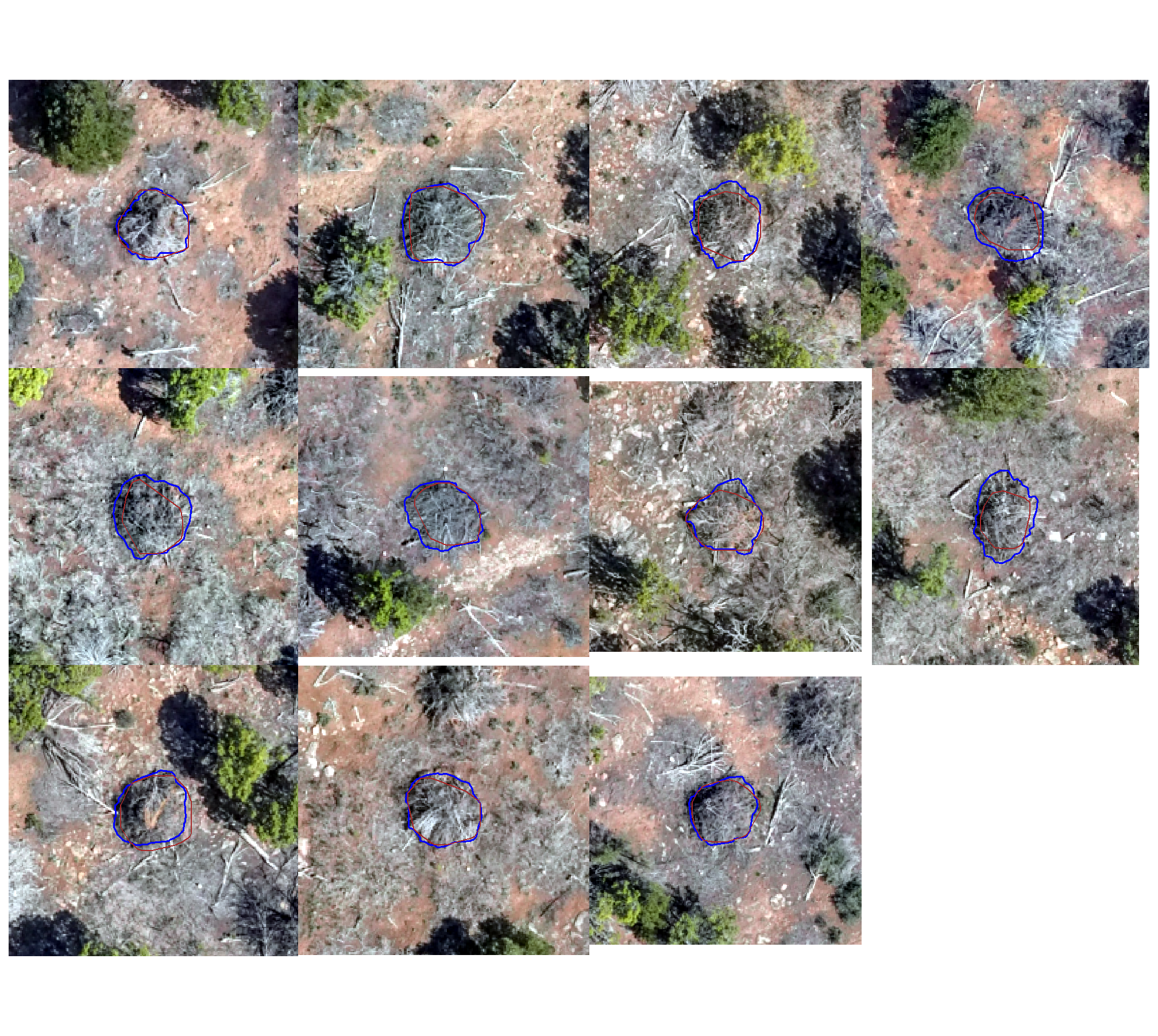pile point locations were collected on the ground using highly accurate Emlid Reach RTK-GPS units. The perimeter of each pile was then digitized in a Geographic Information System (GIS) using these point locations overlaid on a 0.026 m RGB orthomosaic. In this digitization process, the perimeter was based on the main footprint of the pile at ground level, excluding isolated logs or debris extending beyond the primary boundary. These ground truth polygons will be compared to the predicted pile boundaries using the intersection over union (IoU) metric, with a minimum threshold required for a true positive match.