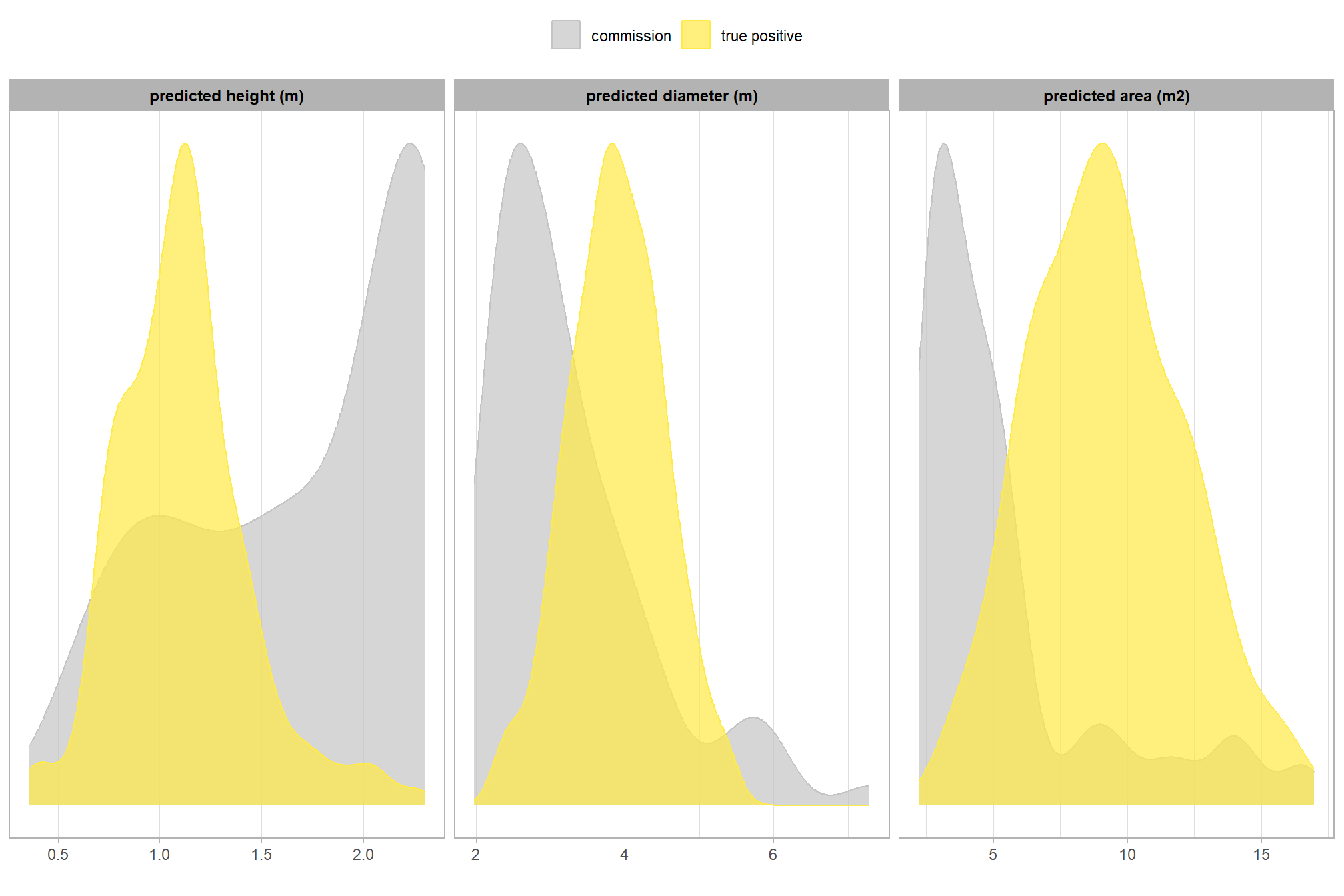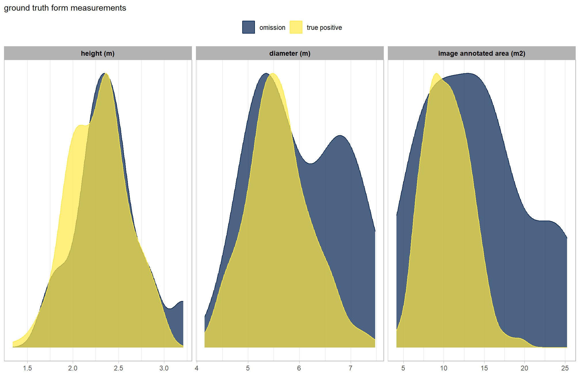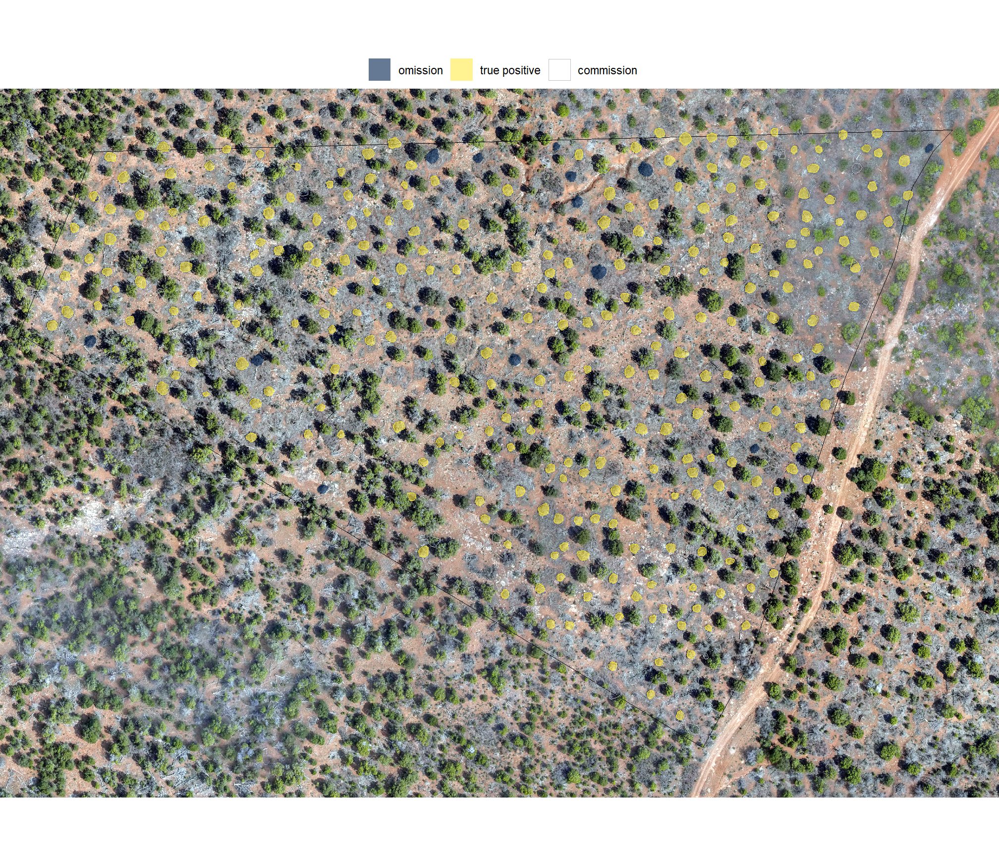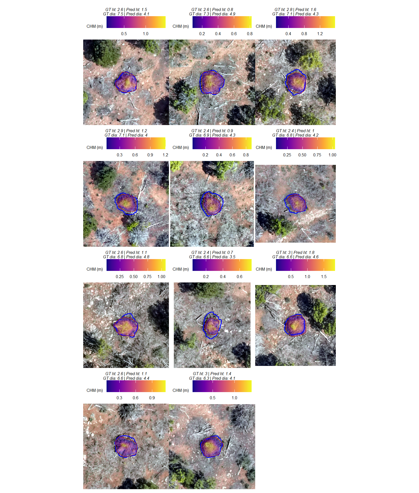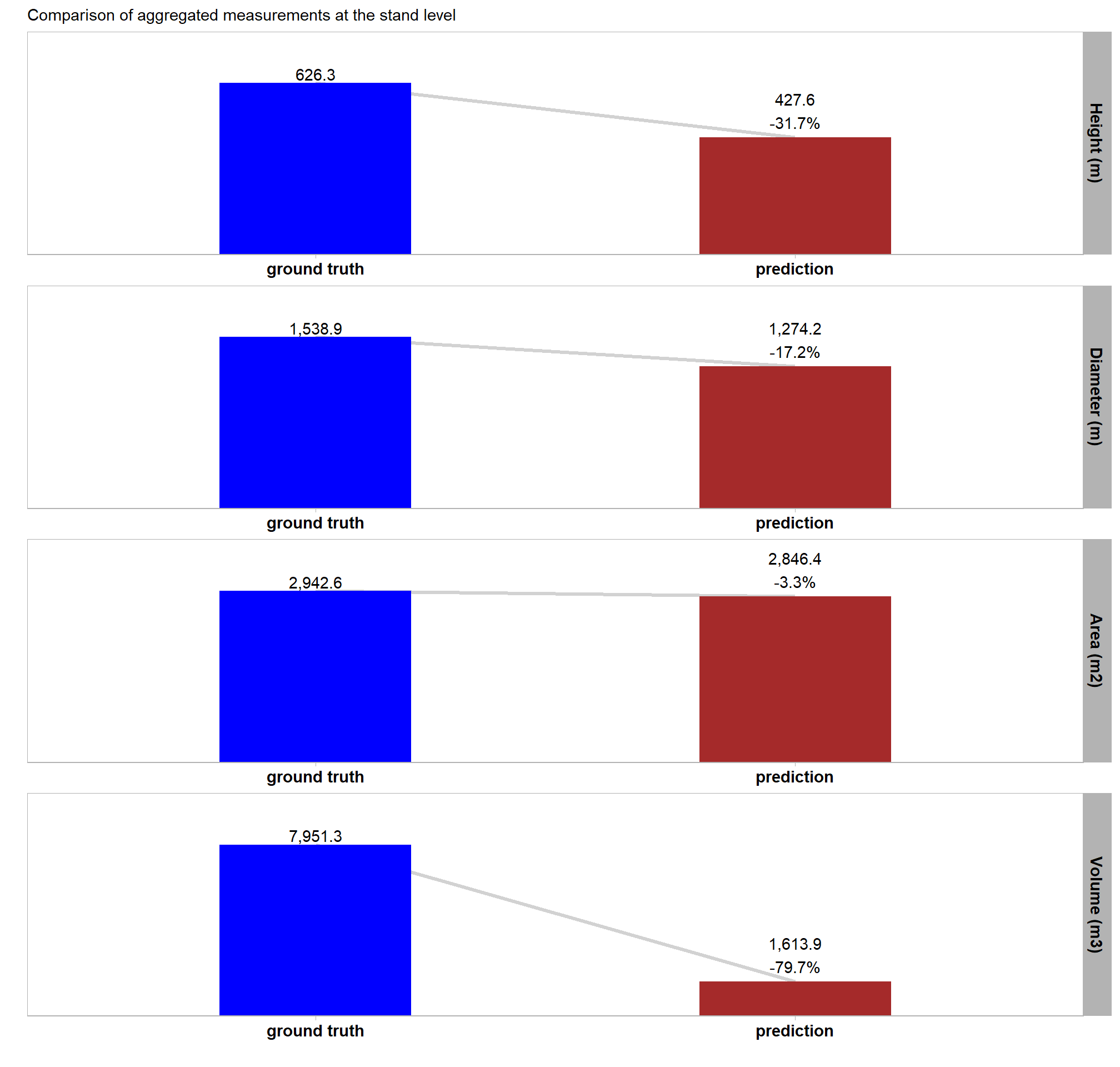 The unreliability of the field-measured height and diameter data was only discovered when initial prediction comparisons failed to meet expectations set by the training data. Consequently, all quantification performance assessment will now be based solely on comparison against image-annotated footprints. This includes: