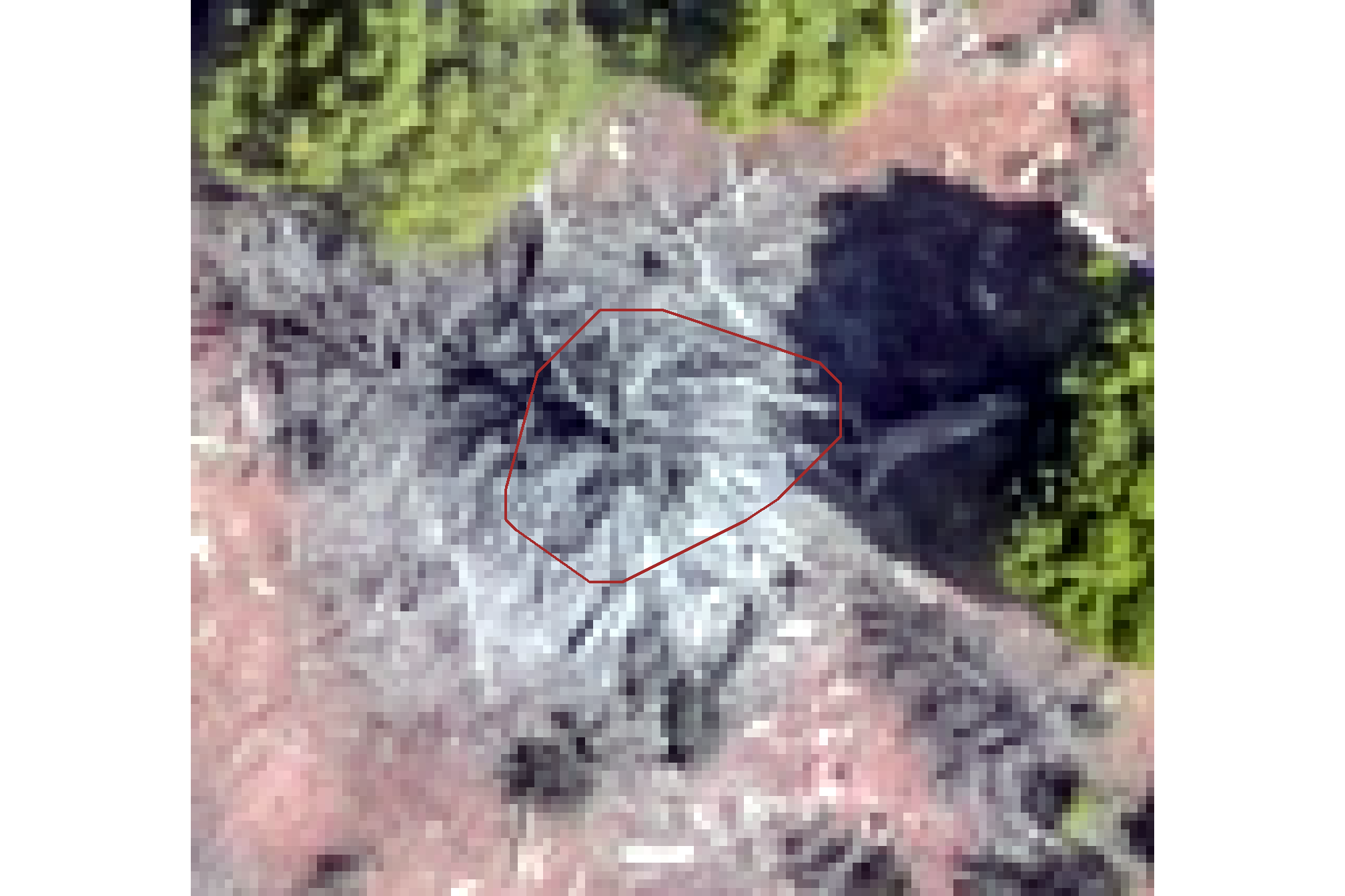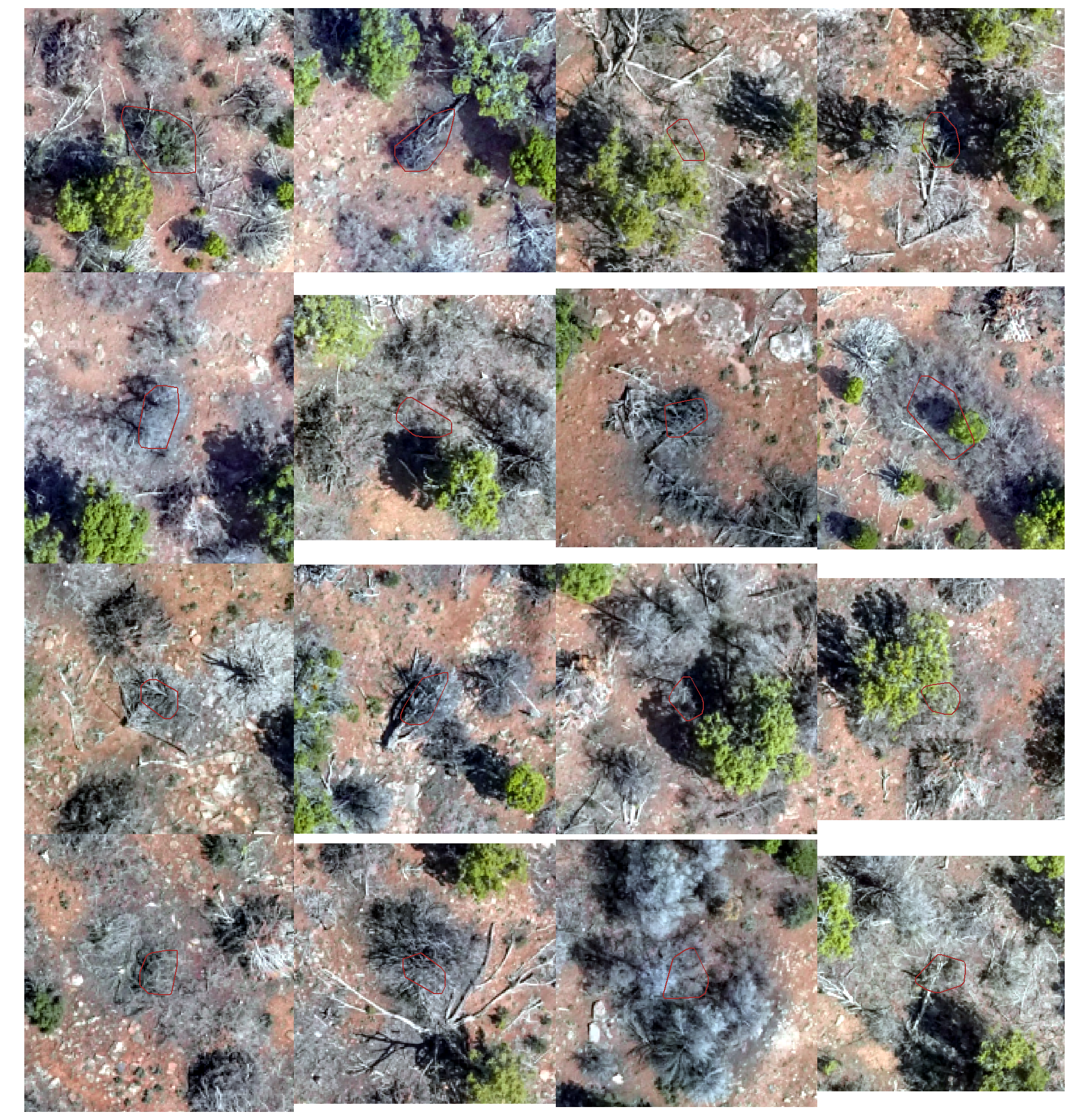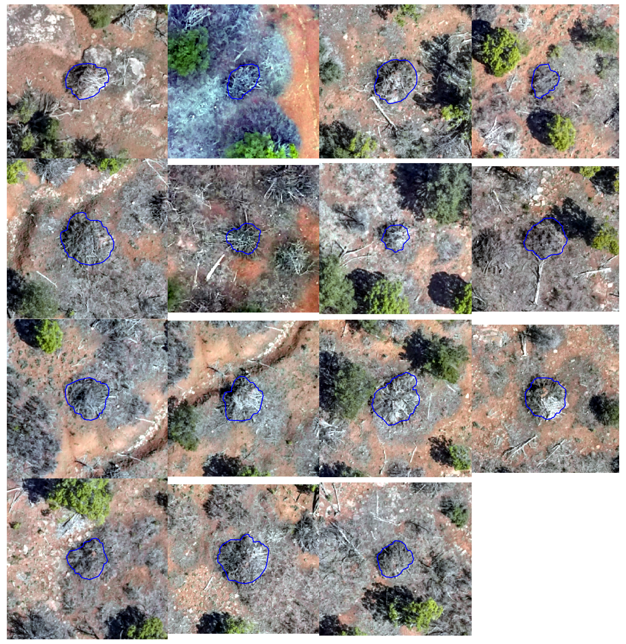 - Massive Machine Pile Site (Validation Ponderosa Pine): Features massive machine piles that exhibit high geometric irregularity, with perimeters ranging from circular to rectangular, representing structures significantly larger and more geometrically distinct than those in the training data.