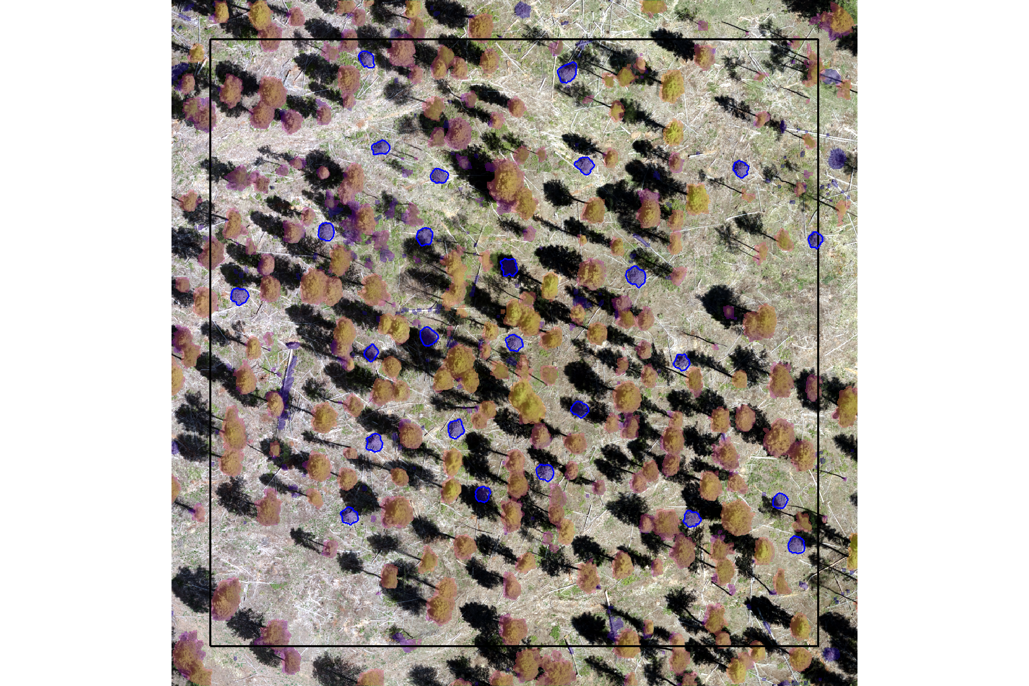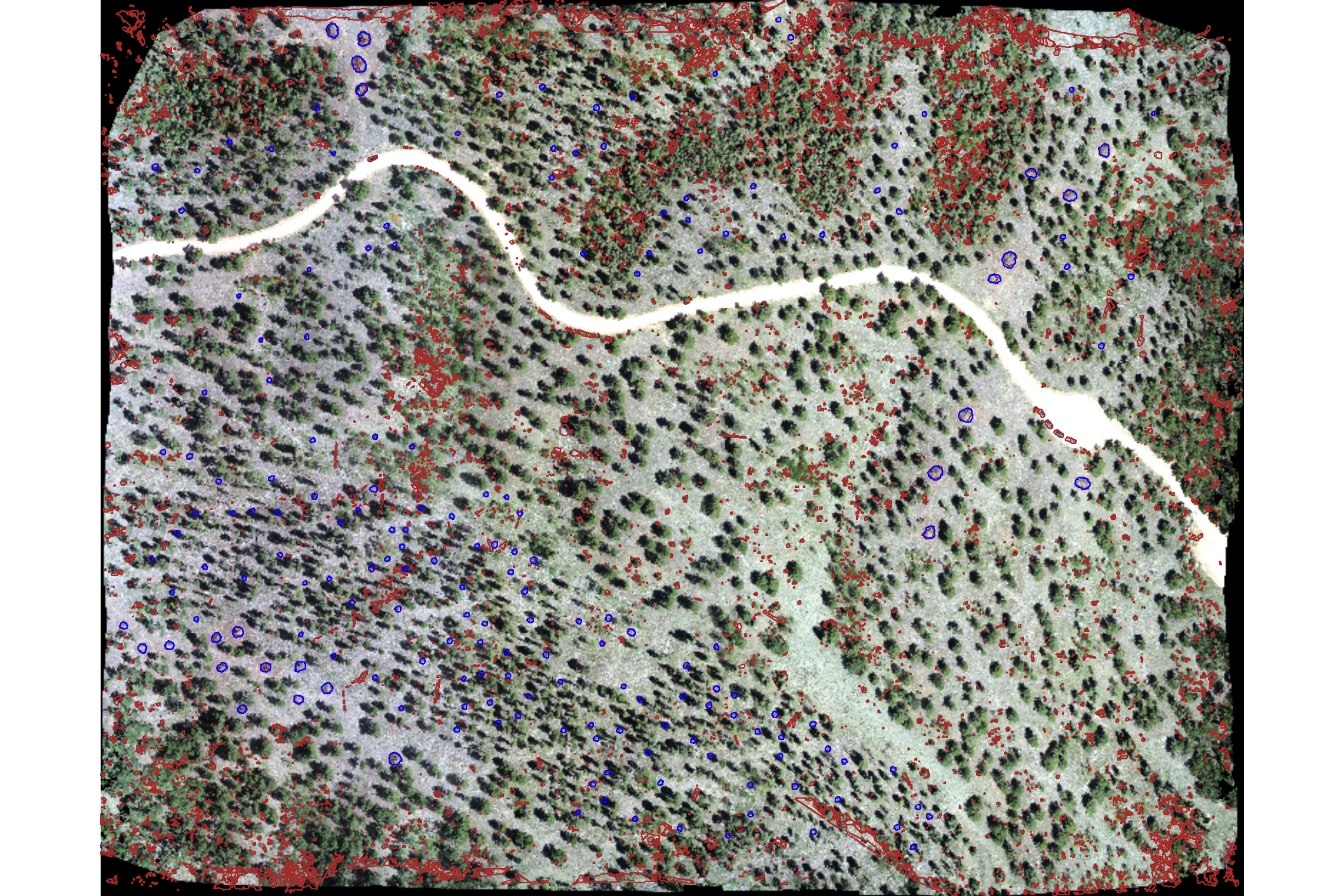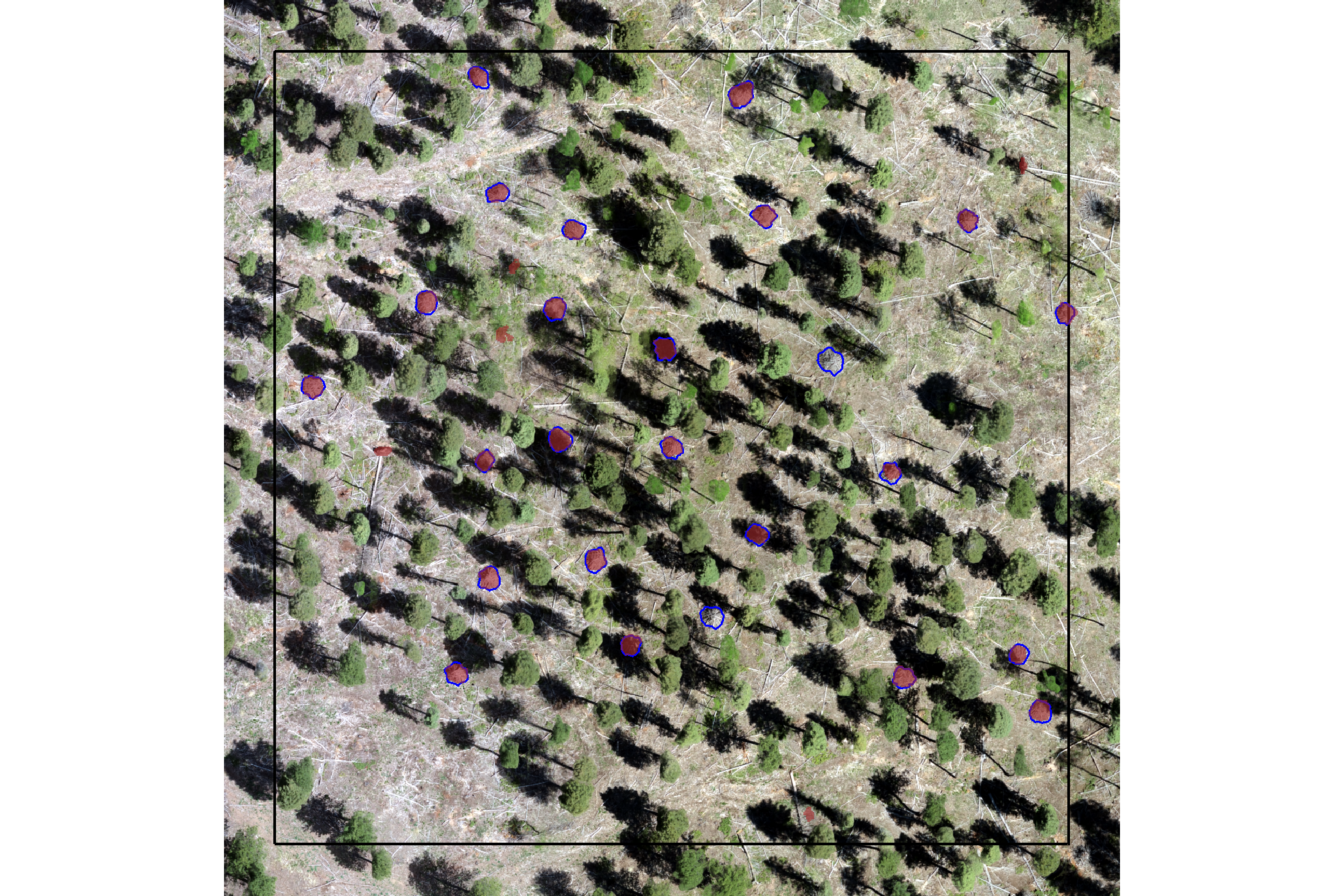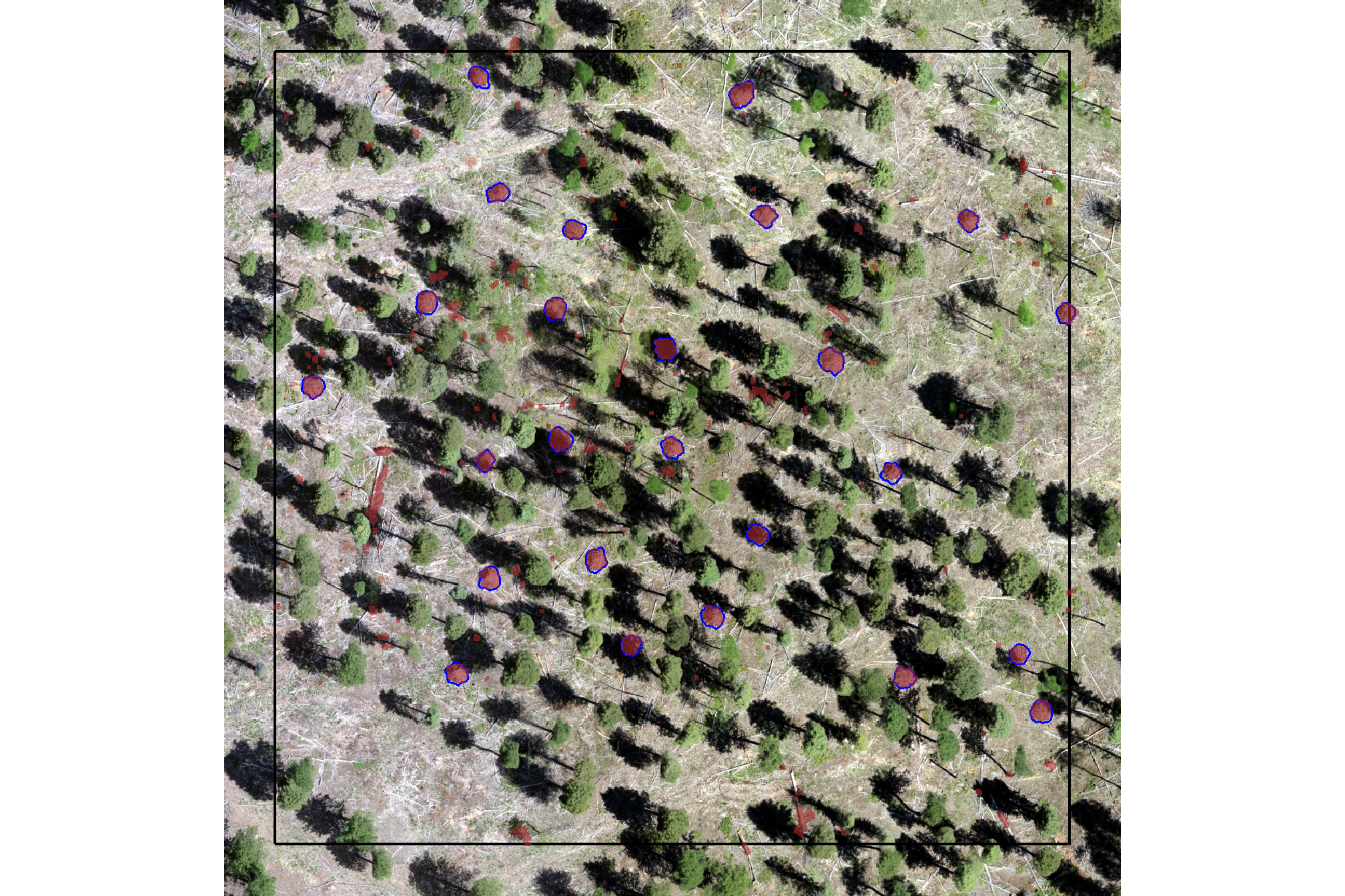 two possible approaches for segmenting piles are to: 1) segment individual trees using a top-down approach and then use the canopy cover as a mask to then identify slash piles; 2) use a bottoms-up approach to perform slash pile segmentation on a lower “slice” of the CHM based on an expected maximum height of a pile
