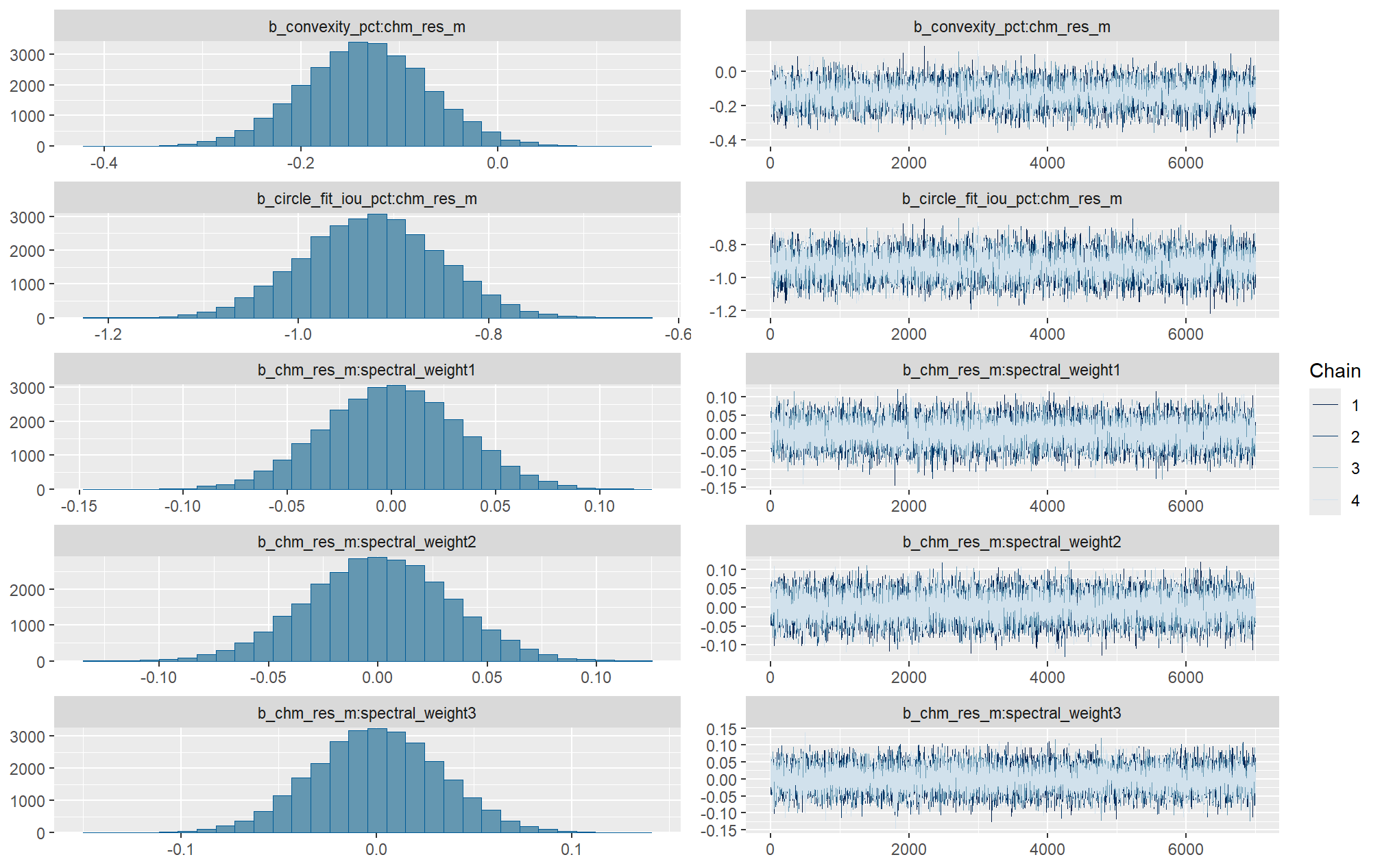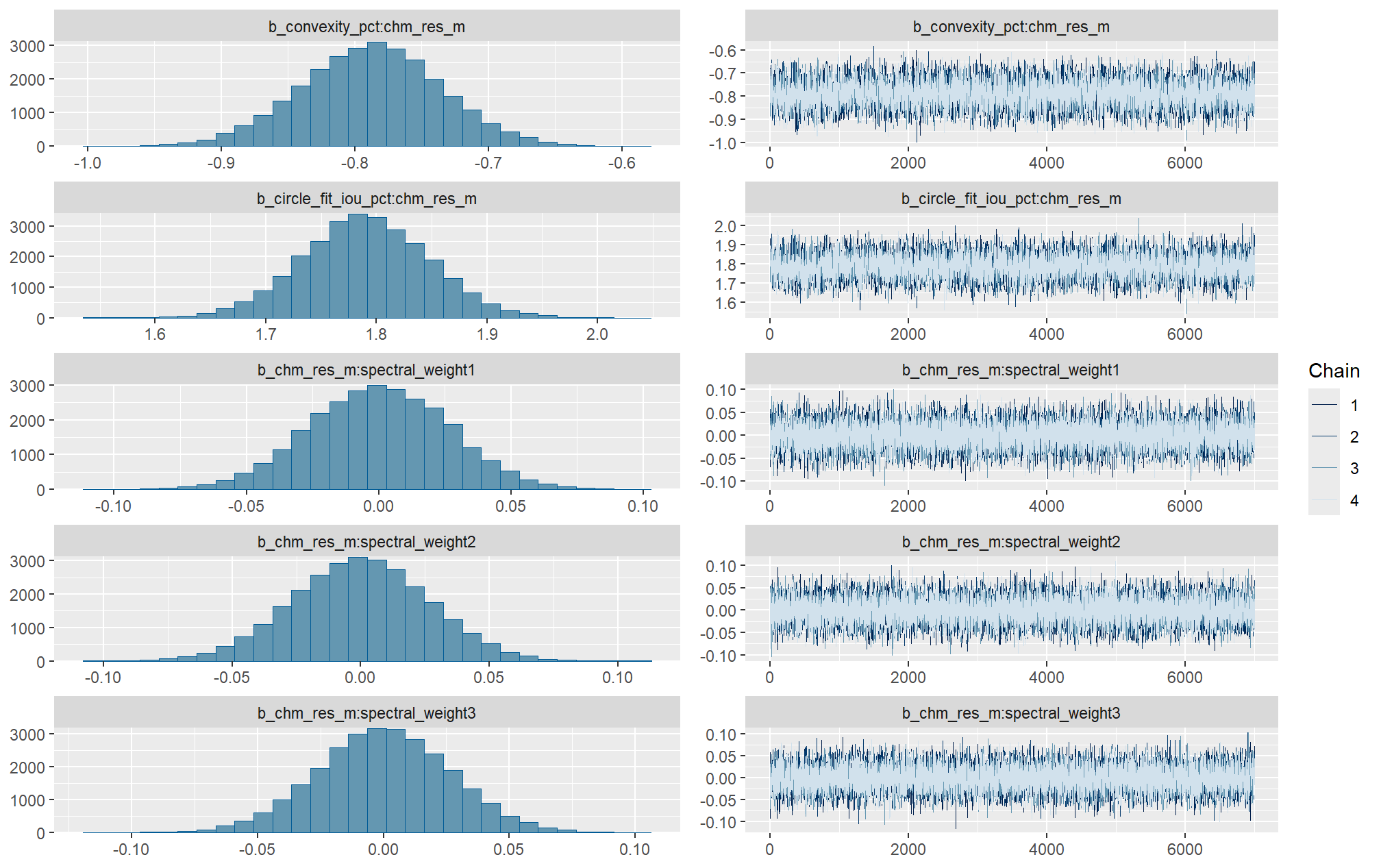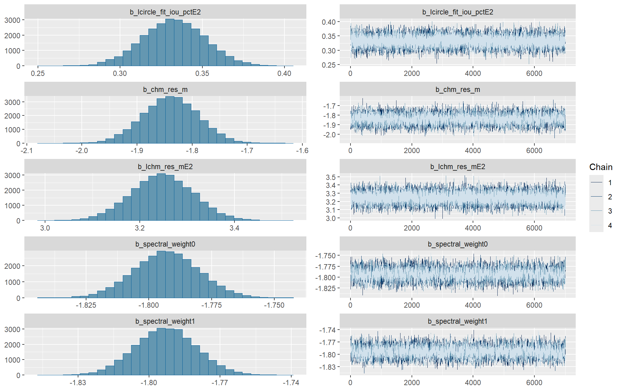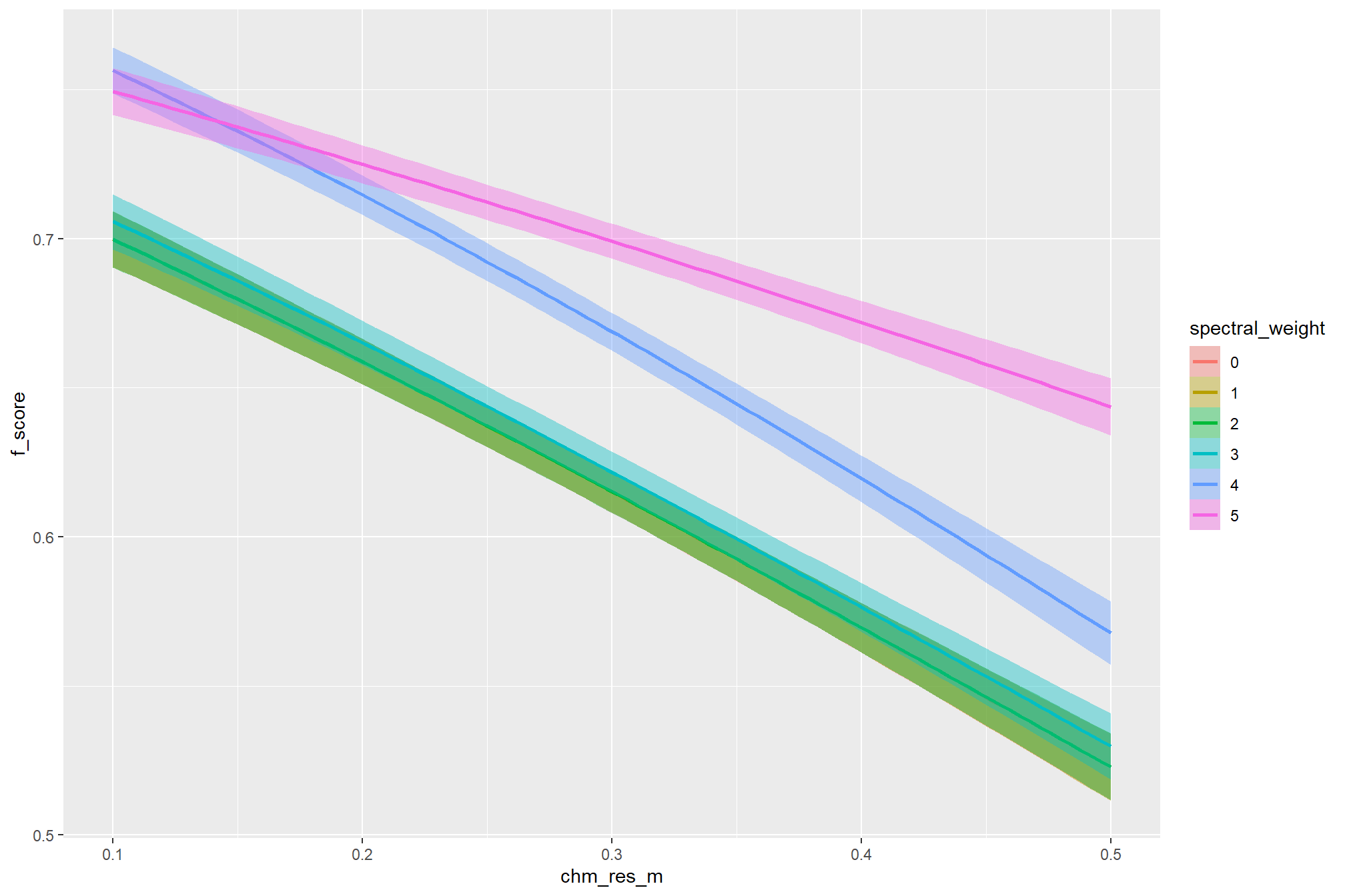 Our Bayesian Beta regression models the F-score with a Beta distribution because it is a proportion between 0 and 1, which ensures that the predictions and uncertainty estimates are always within the valid range. We’re treating the four structural parameters (e.g. max_ht_m and circle_fit_iou_pct) and the CHM resolution (chm_res_m) as metric (i.e., continuous) variables, as this is statistically sound for our data and allows for a continuous interpretation where the model coefficient will represent the change in F-score for a one-unit change in the parameter value. The spectral_weight parameter, however, will be treated as nominal to capture its discrete effects without assuming a linear relationship.