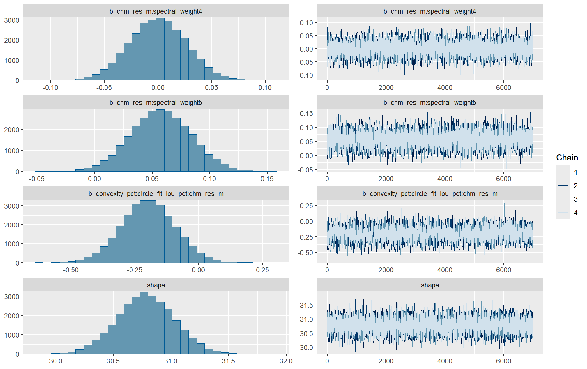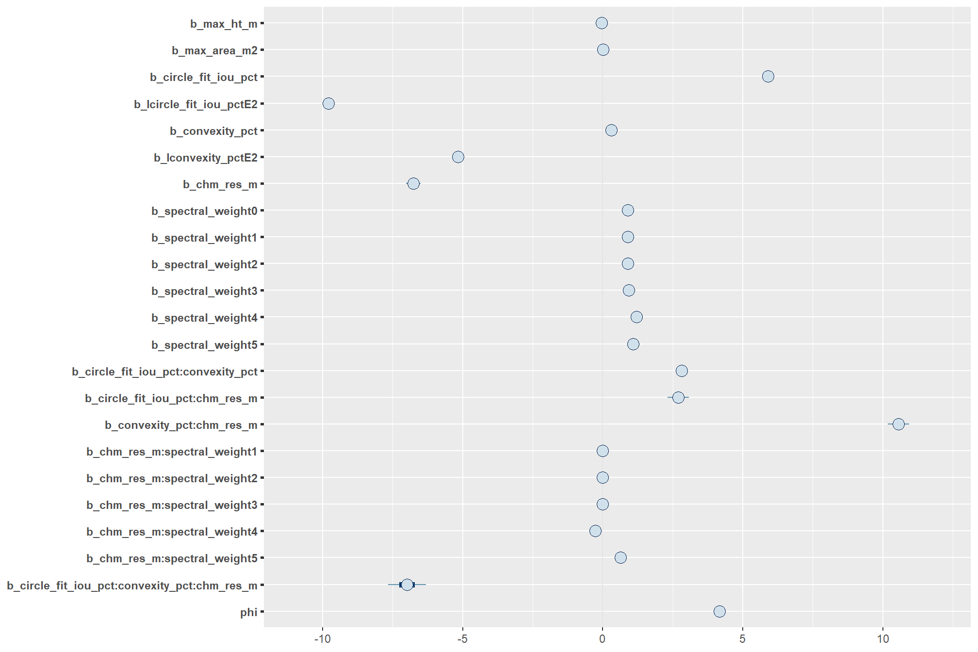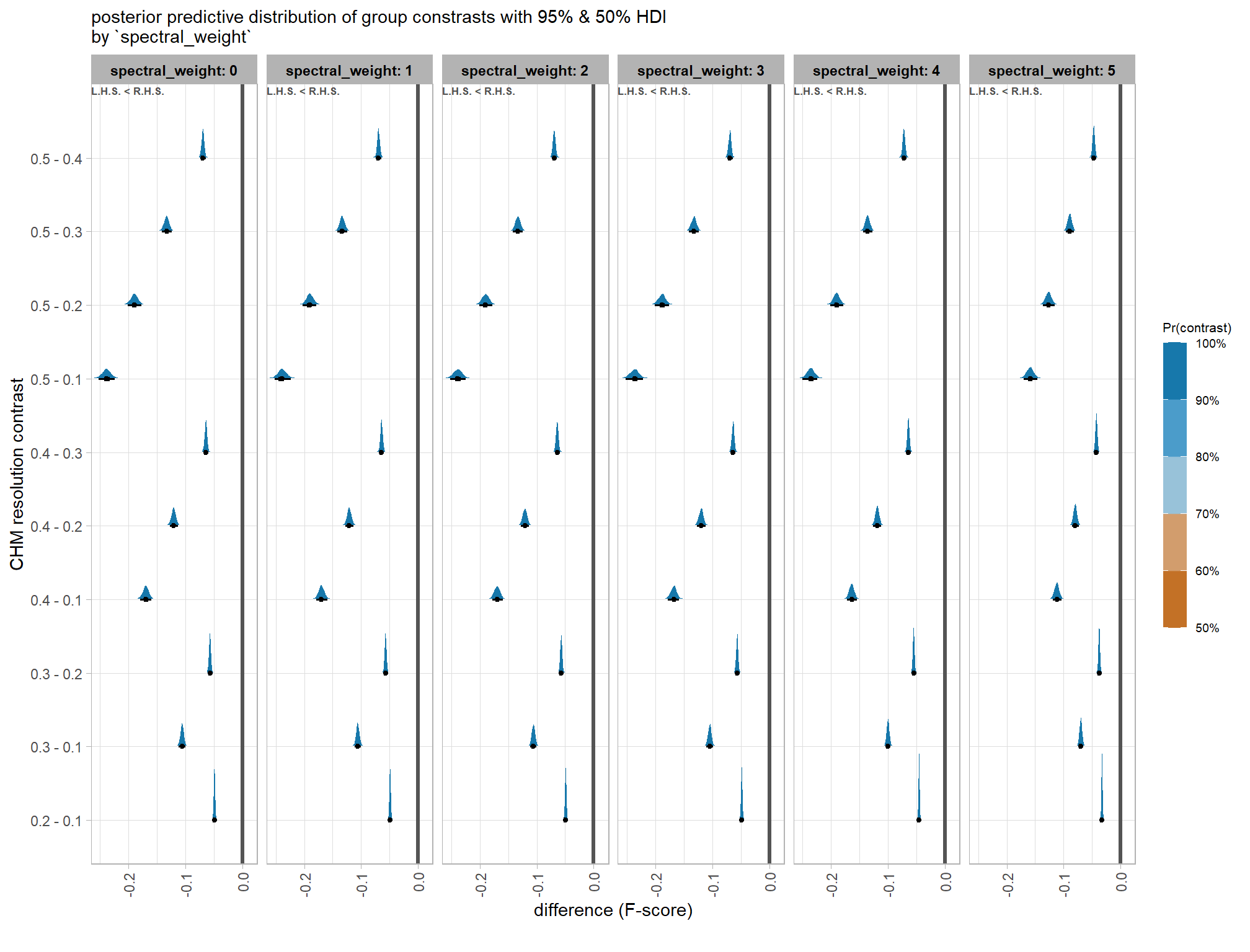 Our Bayesian Beta regression models the F-score with a Beta distribution because it is a proportion between 0 and 1, which ensures that the predictions and uncertainty estimates are always within the valid range. We’re treating the four structural parameters (e.g. max_ht_m and circle_fit_iou_pct) and the CHM resolution (chm_res_m) as metric (i.e., continuous) variables, as this is statistically sound for our data and allows for a continuous interpretation where the model coefficient will represent the change in F-score for a one-unit change in the parameter value. The spectral_weight parameter, however, will be treated as nominal to capture its discrete effects without assuming a linear relationship.