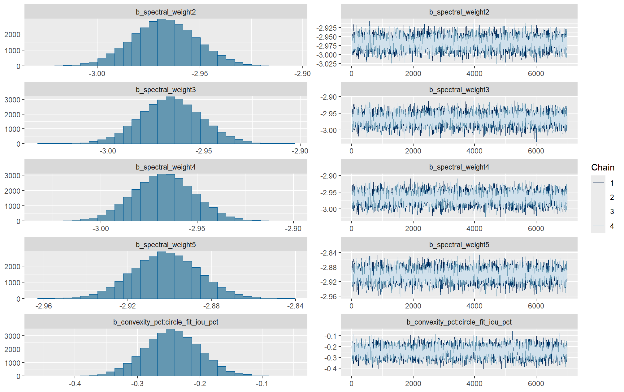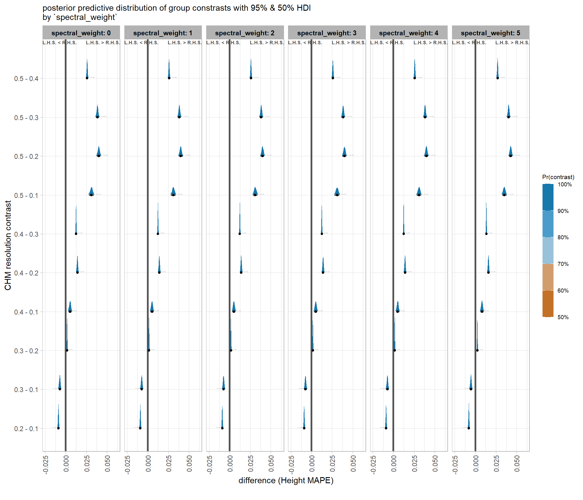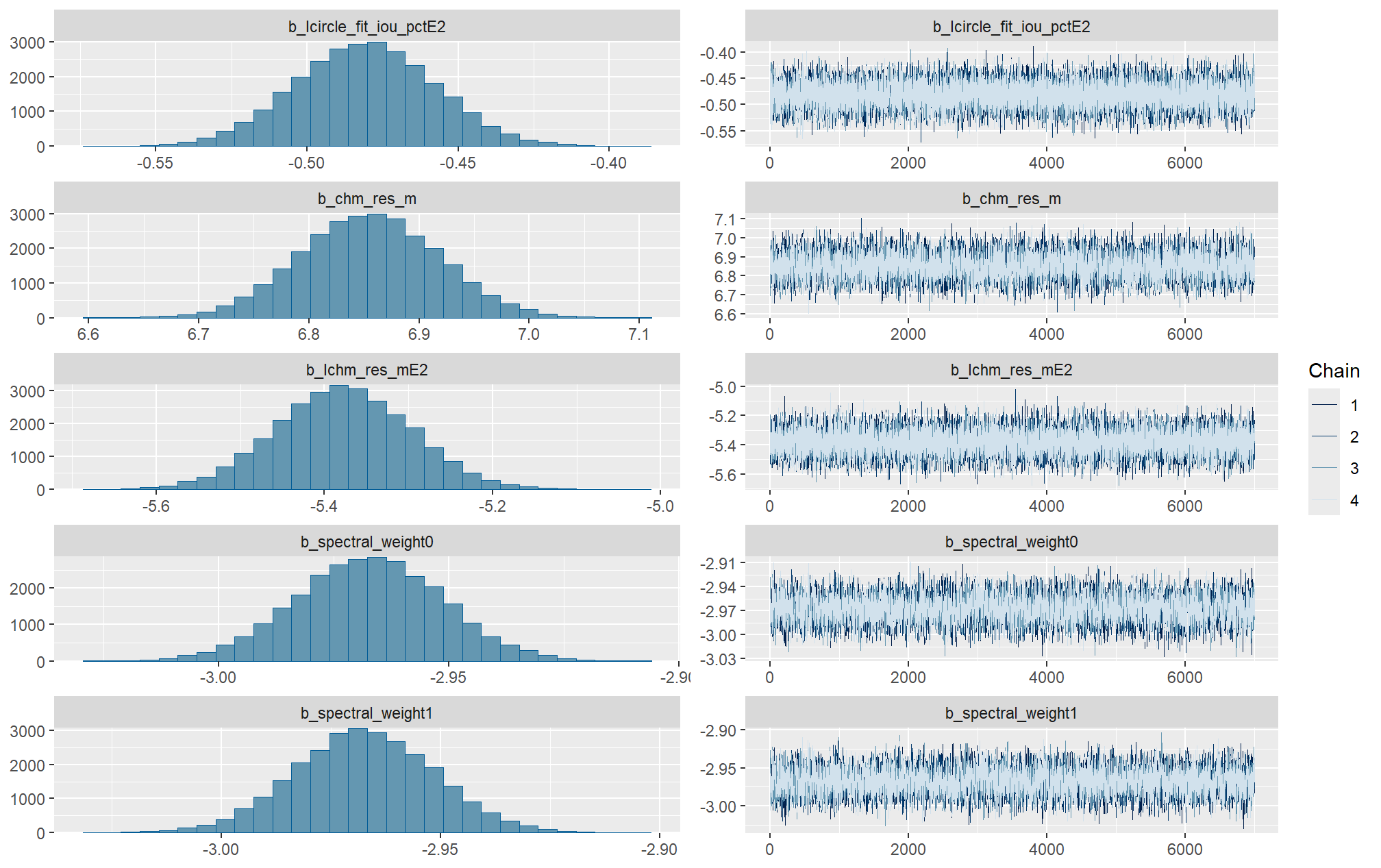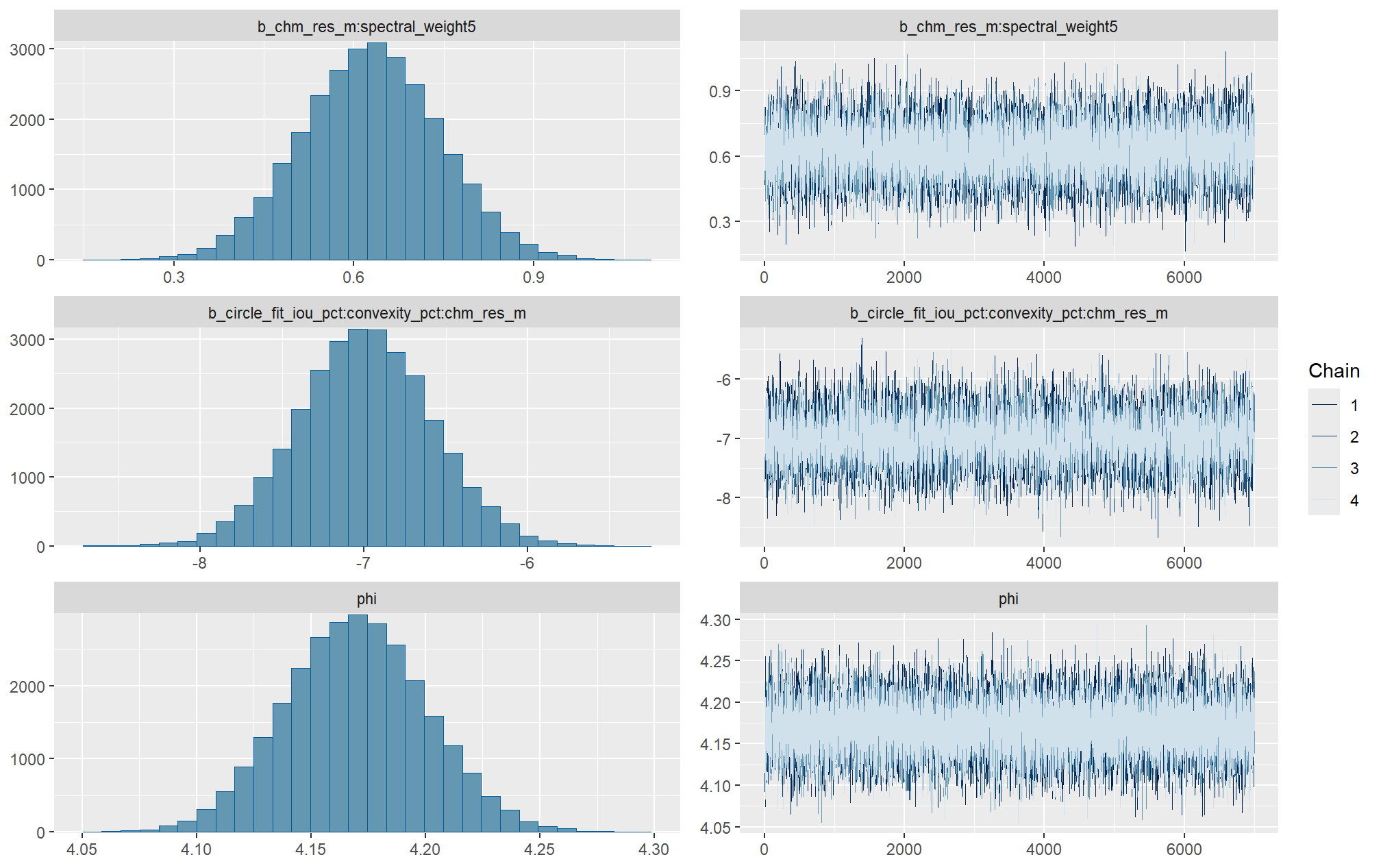 Our Bayesian Beta regression models the F-score with a Beta distribution because it is a proportion between 0 and 1, which ensures that the predictions and uncertainty estimates are always within the valid range. We’re treating the four structural parameters (e.g. max_ht_m and circle_fit_iou_pct) and the CHM resolution (chm_res_m) as metric (i.e., continuous) variables, as this is statistically sound for our data and allows for a continuous interpretation where the model coefficient will represent the change in F-score for a one-unit change in the parameter value. The spectral_weight parameter, however, will be treated as nominal to capture its discrete effects without assuming a linear relationship.