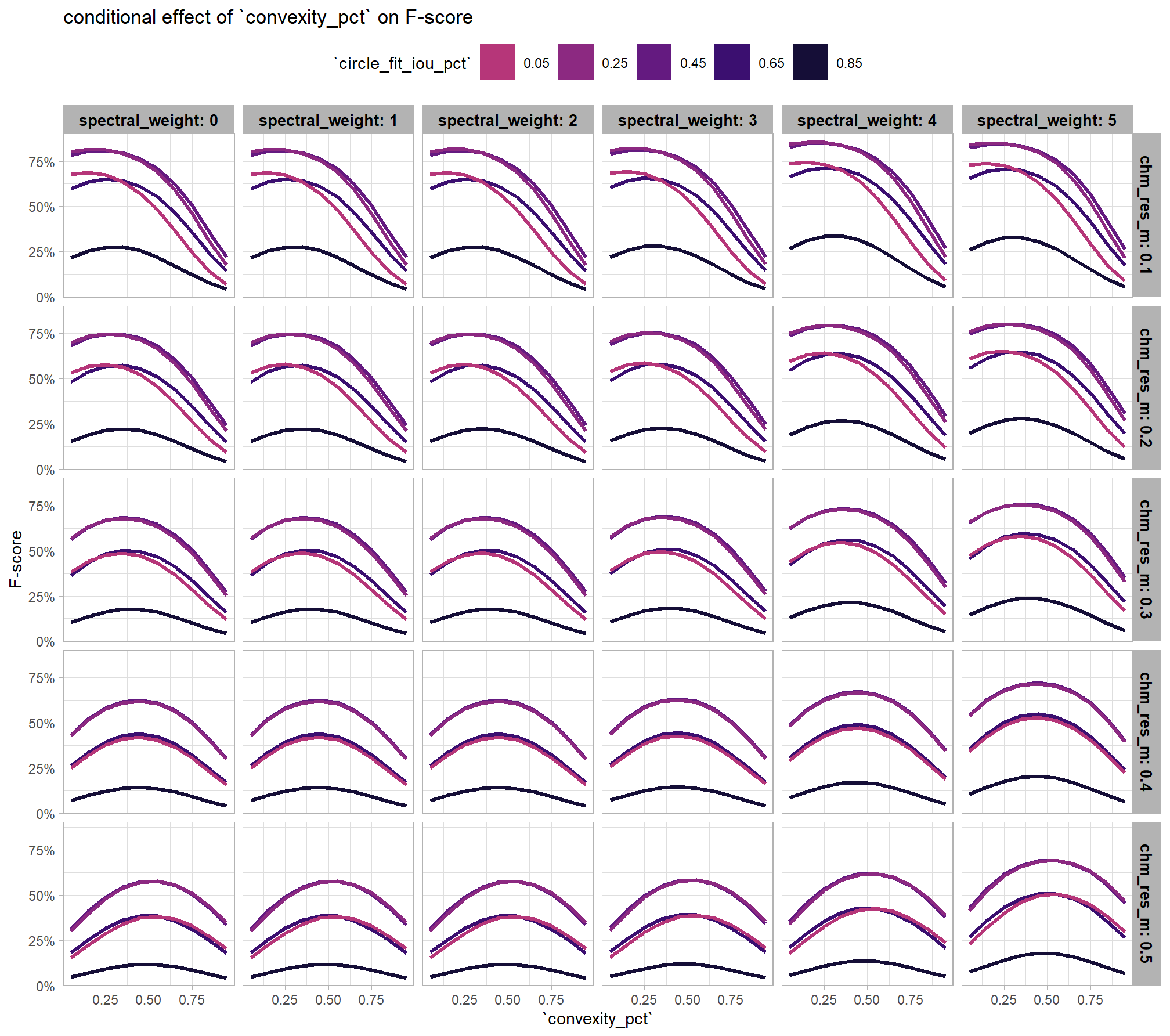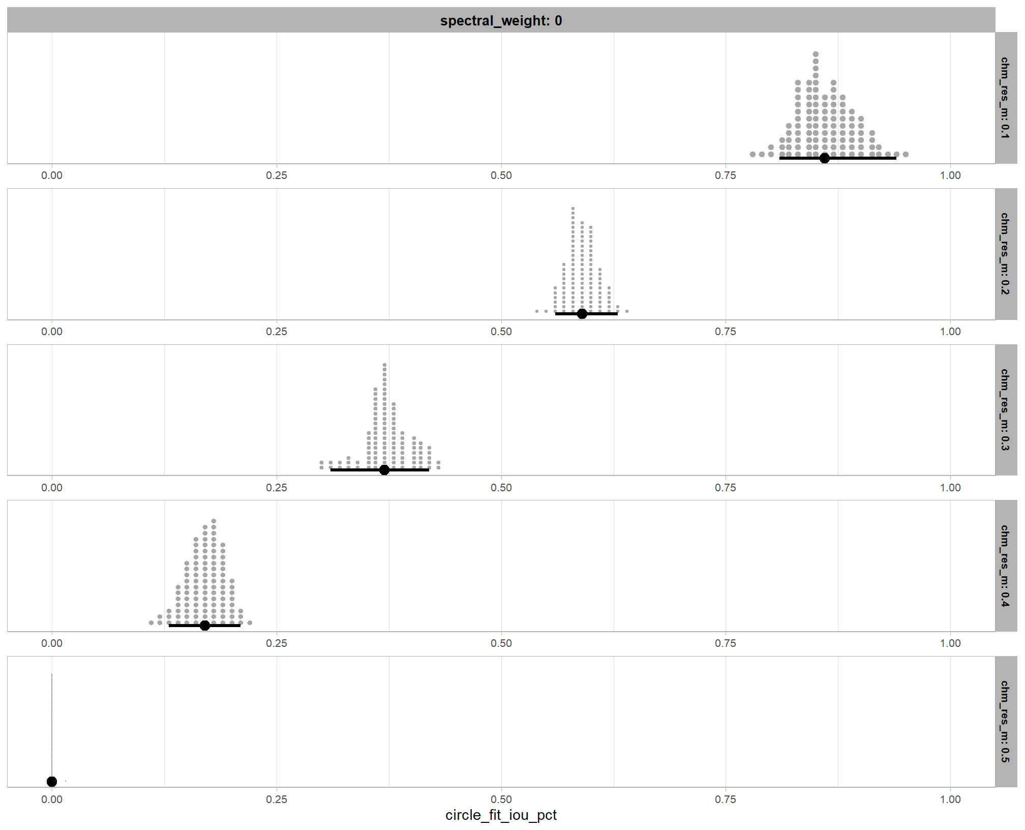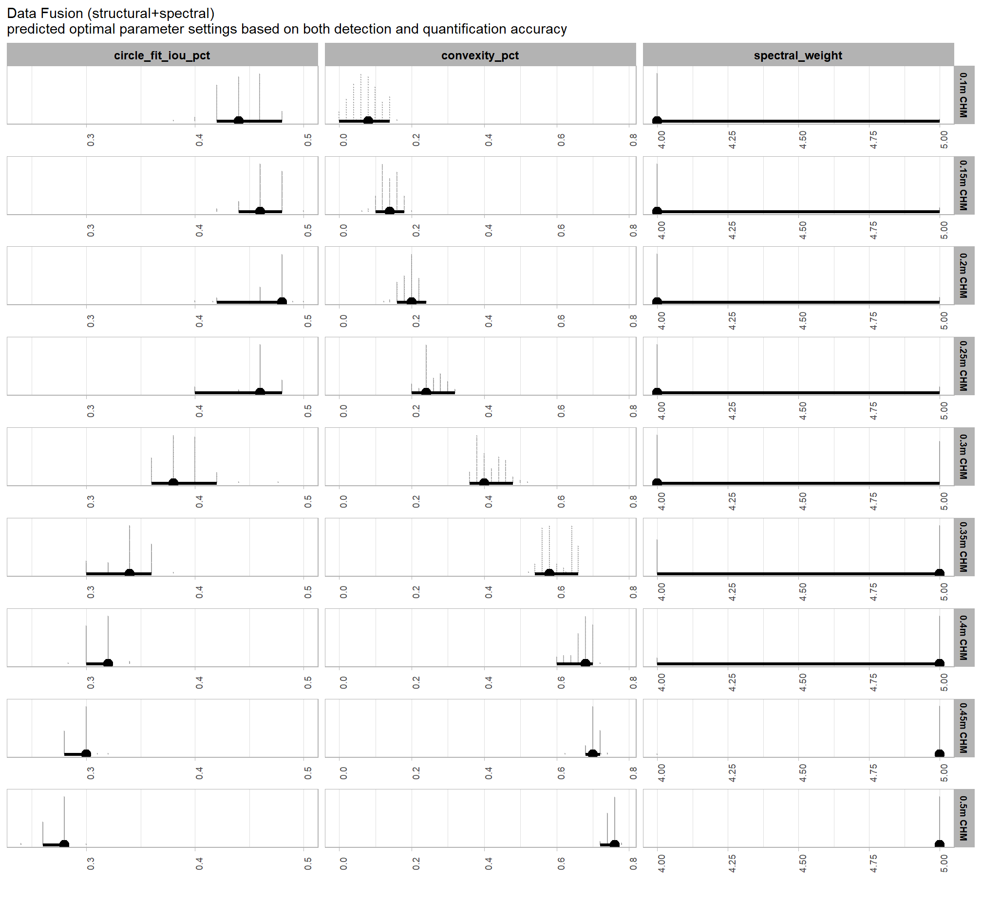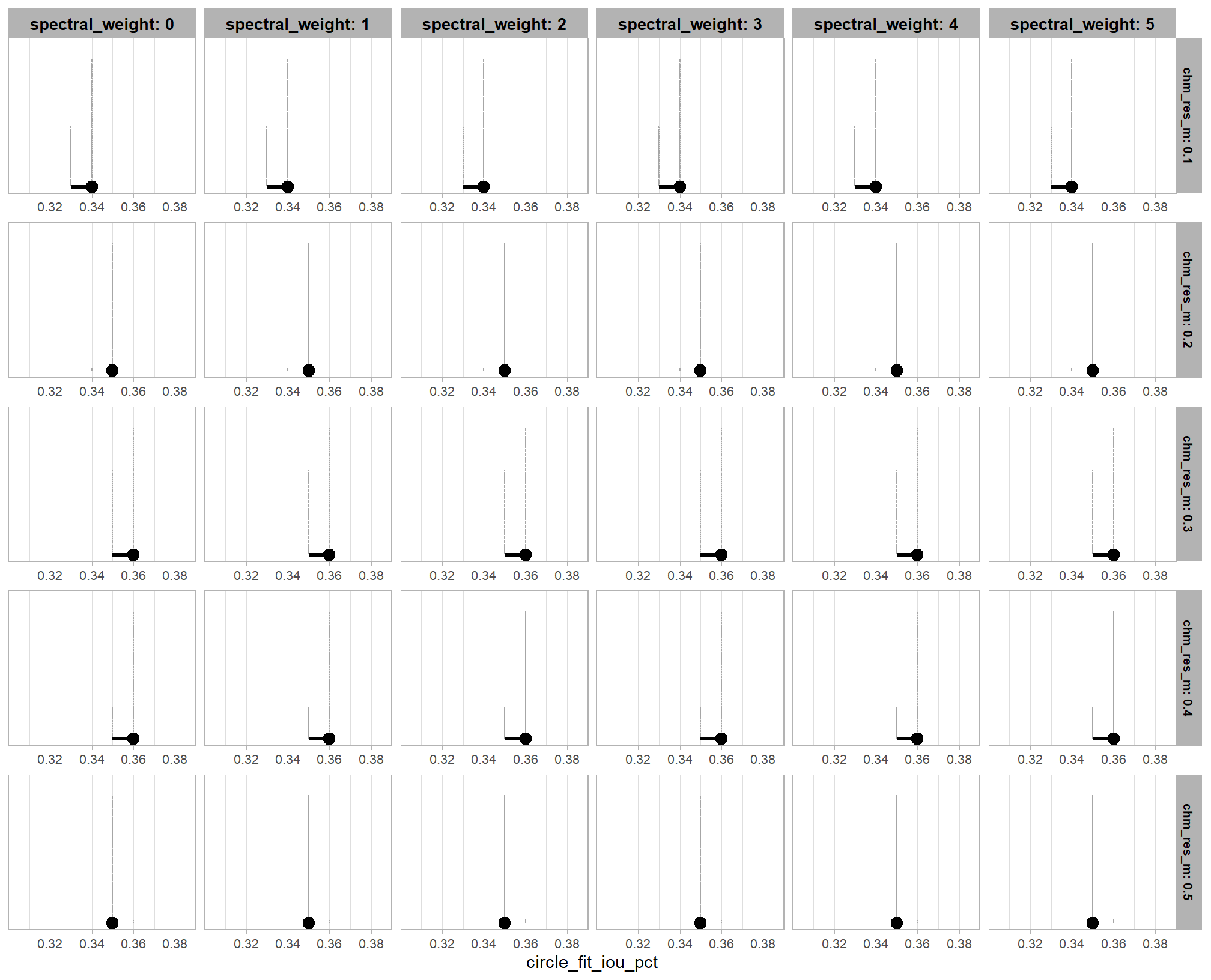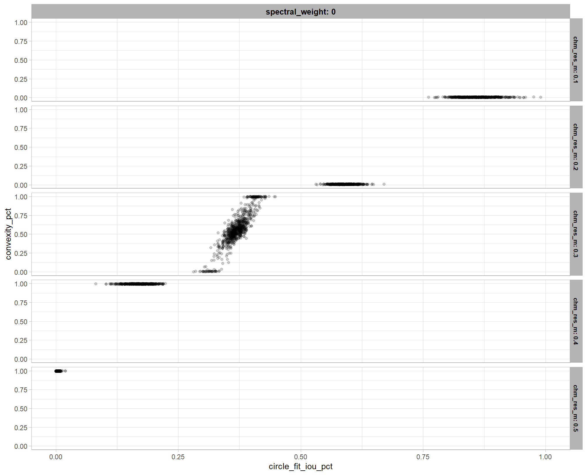 a row is unique by the full set of parameters tested: max_ht_m, max_area_m2, convexity_pct, circle_fit_iou_pct, chm_res_m, spectral_weight