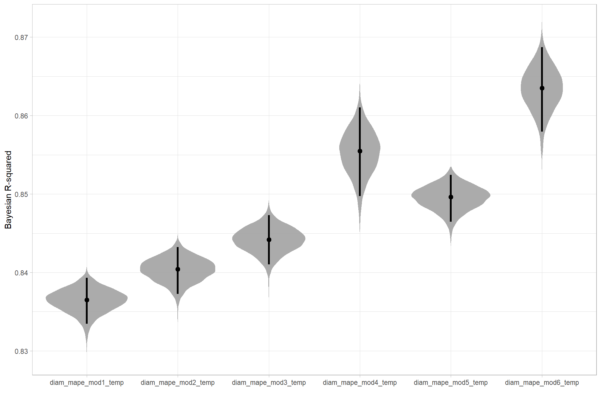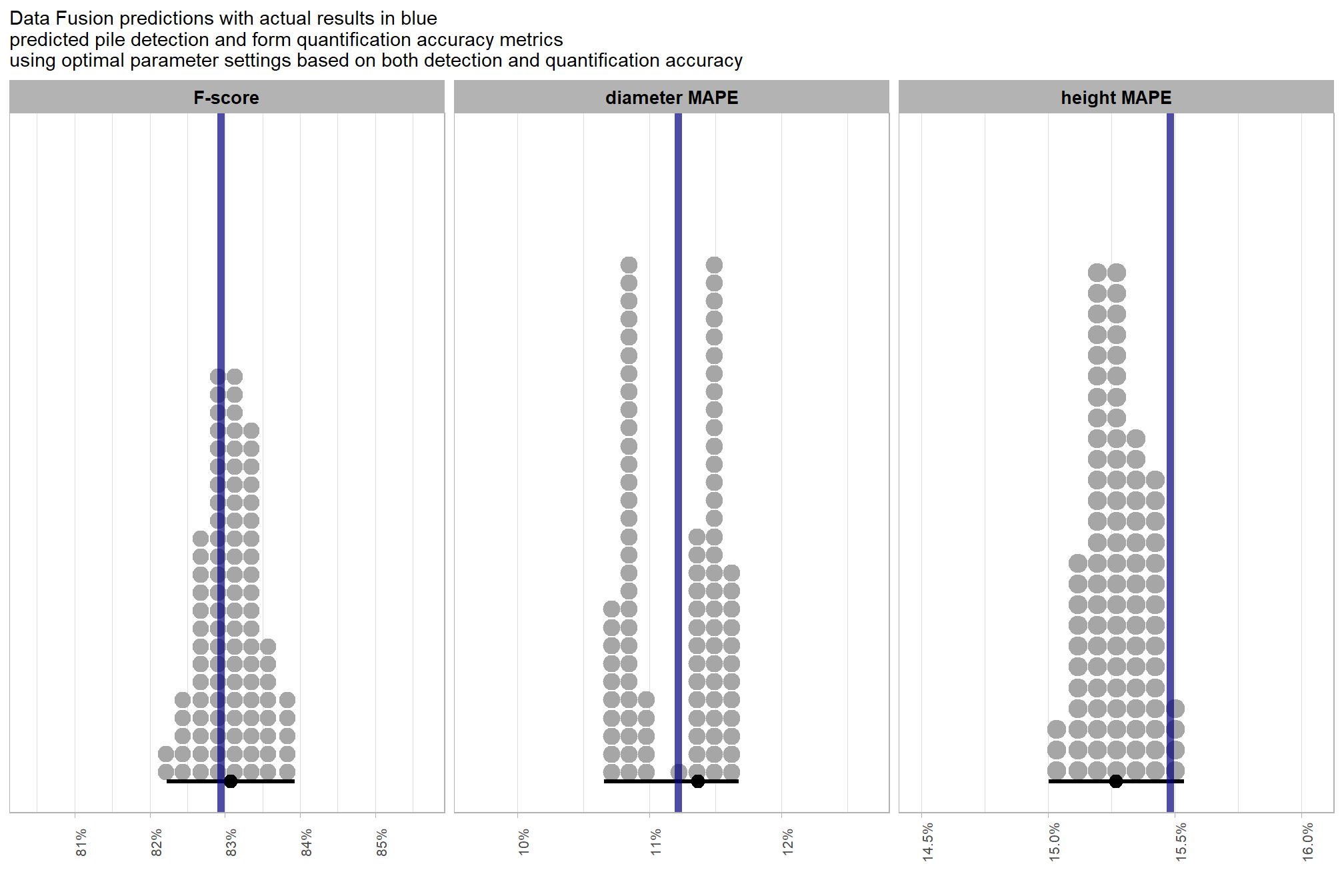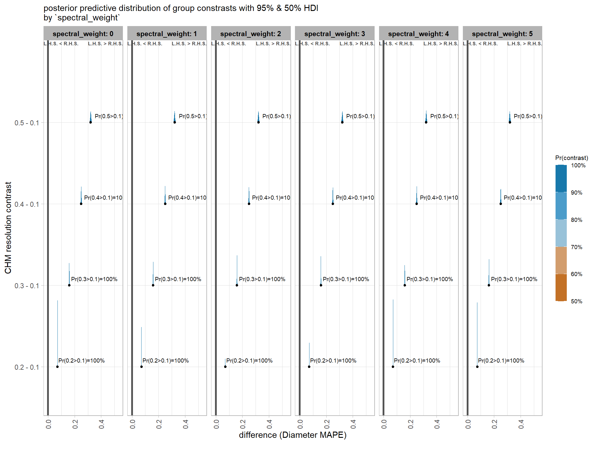In this prior section we performed sensitivity testing of our slash pile detection method using multiple CHM raster resolutions and ended up testing tens of thousands of possible parameterizations and input data combinations. using the tested parameter and data input combinations, we’re going build statistical models to quantify the influence of these parameters and input data on pile detection and quantification accuracy. we’ll utilize a Bayesian modelling framework which will allow us to probabilistically quantify parameter influence while accounting for uncertainty.