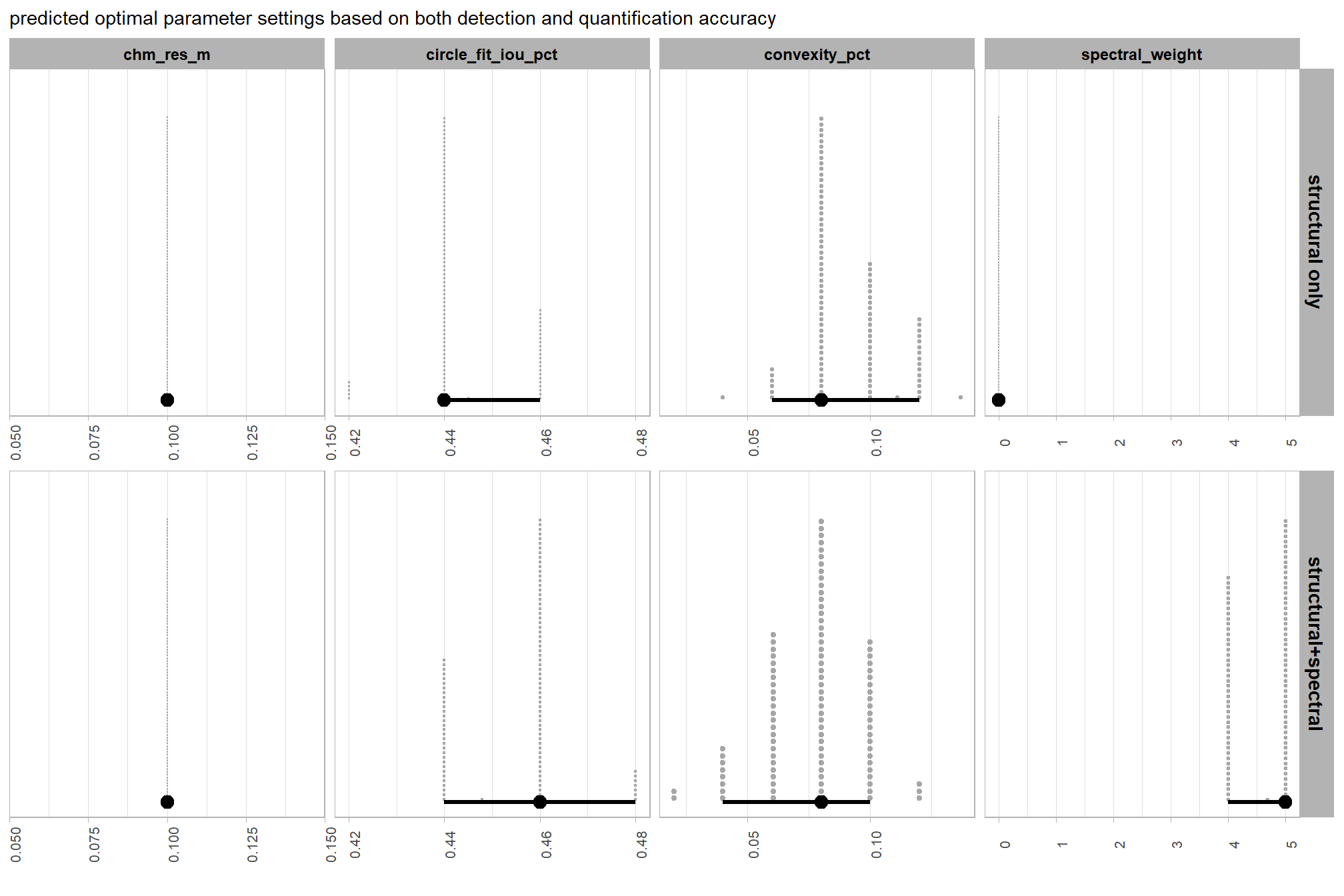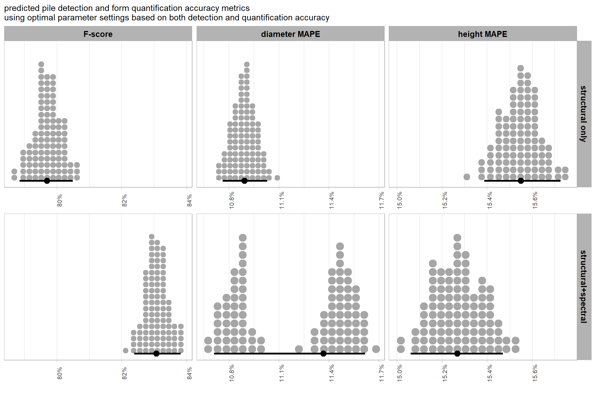 our analysis data set will be the param_combos_spectral_ranked data which includes accuracy measurements at the parameter combination level using both structural data only as well as structural and spectral data in our data fusion approach. in this data, a row is unique by the full set of parameters and input data tested: max_ht_m, max_area_m2, convexity_pct, circle_fit_iou_pct, chm_res_m, spectral_weight. there are four structural parameters: max_ht_m, max_area_m2, convexity_pct, circle_fit_iou_pct which are used to determine candidate slash piles from the CHM data alone, and the chm_res_m and spectral_weight parameters represent the input data with spectral_weight classifying if spectral data was not used (i.e. spectral_weight = 0), or if spectral data was used, what the weighting of that spectral data was on a 1-5 scale where the number represents the number of individual spectral index thresholds that must be met for a candidate pile detected from the structural data to be kept. for example, a value of “5” requires that all spectral criteria be met and will result in more candidate piles being filtered out than a value of “3”. See this section for full details on the data fusion approach.