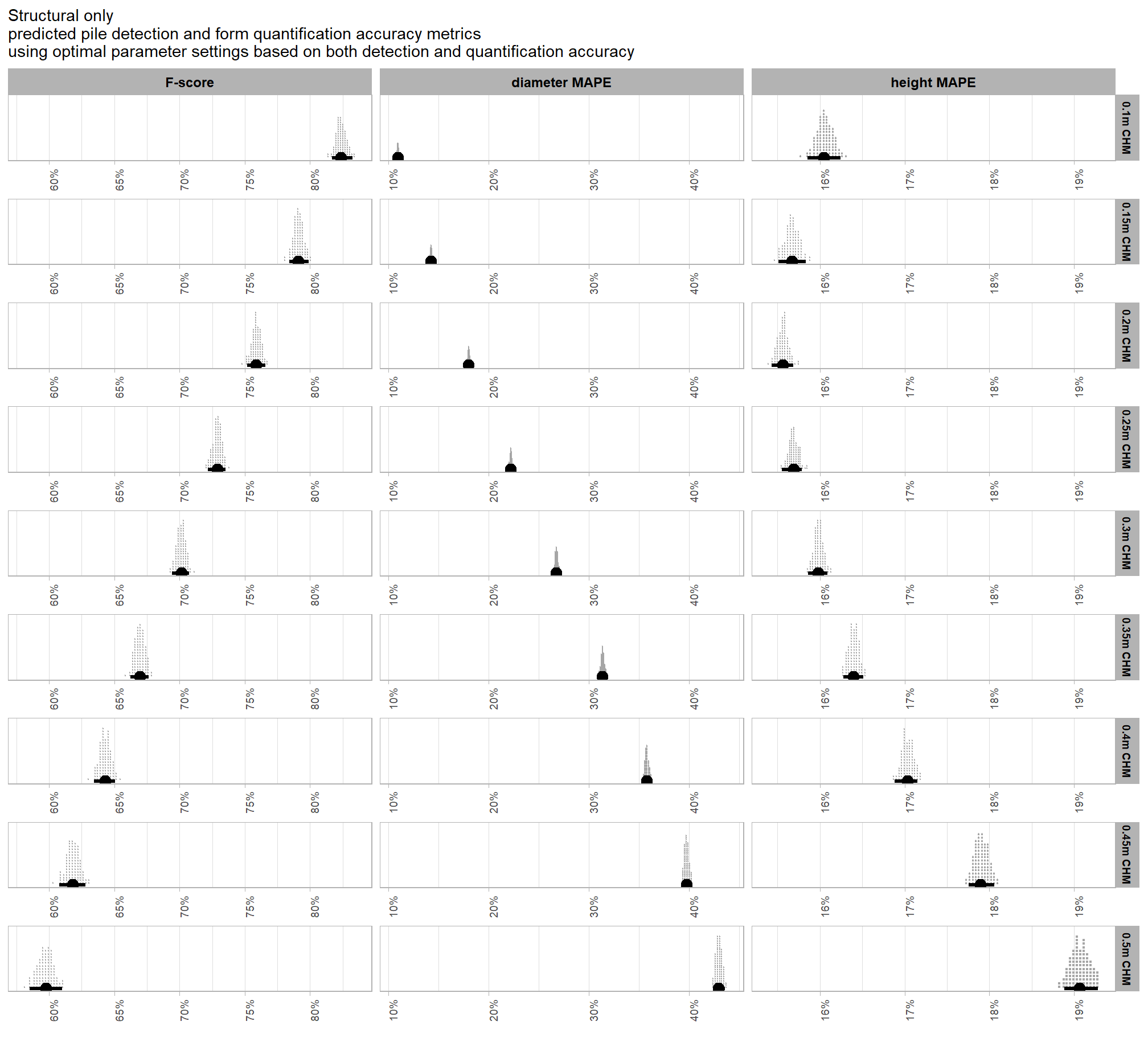 To mitigate the risk of vastly underpredicted heights for these tall outliers, one can increase the convexity_pct parameter. Making this filtering more strict will remove the outlier height predictions and improve height quantification accuracy for true positive matches, but will likely reduce the detection rate as these piles become false negatives (omissions). Alternatively, one could increase the max_ht_m setting to be less restrictive with the height filtering; this would have the effect of estimating a more accurate height value for these tall piles but would potentially introduce new false positive predictions that are actually trees (or yurts?). If spectral data is available to filter these after structural segmentation, then this might be the preferred path to improve height quantification accuracy while maintaining detection accuracy. The choice ultimately depends on whether the user prioritizes detection rate or height quantification accuracy.