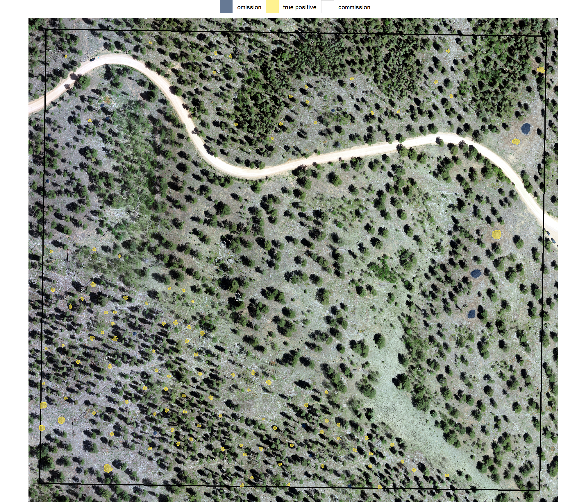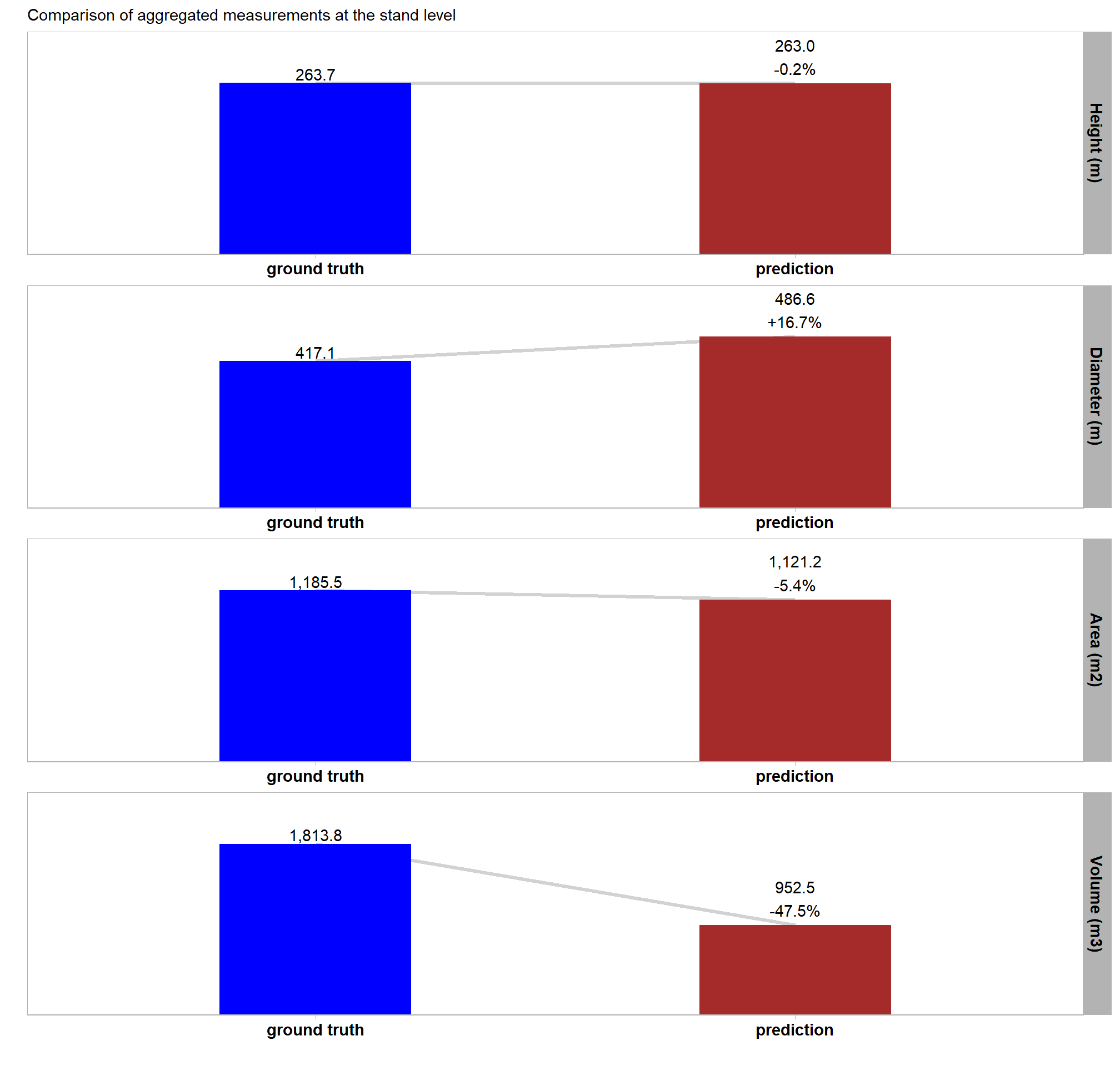 before we leave, let’s summarize the measurement values of the predictions (true positive and false positive) and the ground truth data (true positive and false negative) over the entire stand (this is similar to a basal area comparison in a forest inventory)