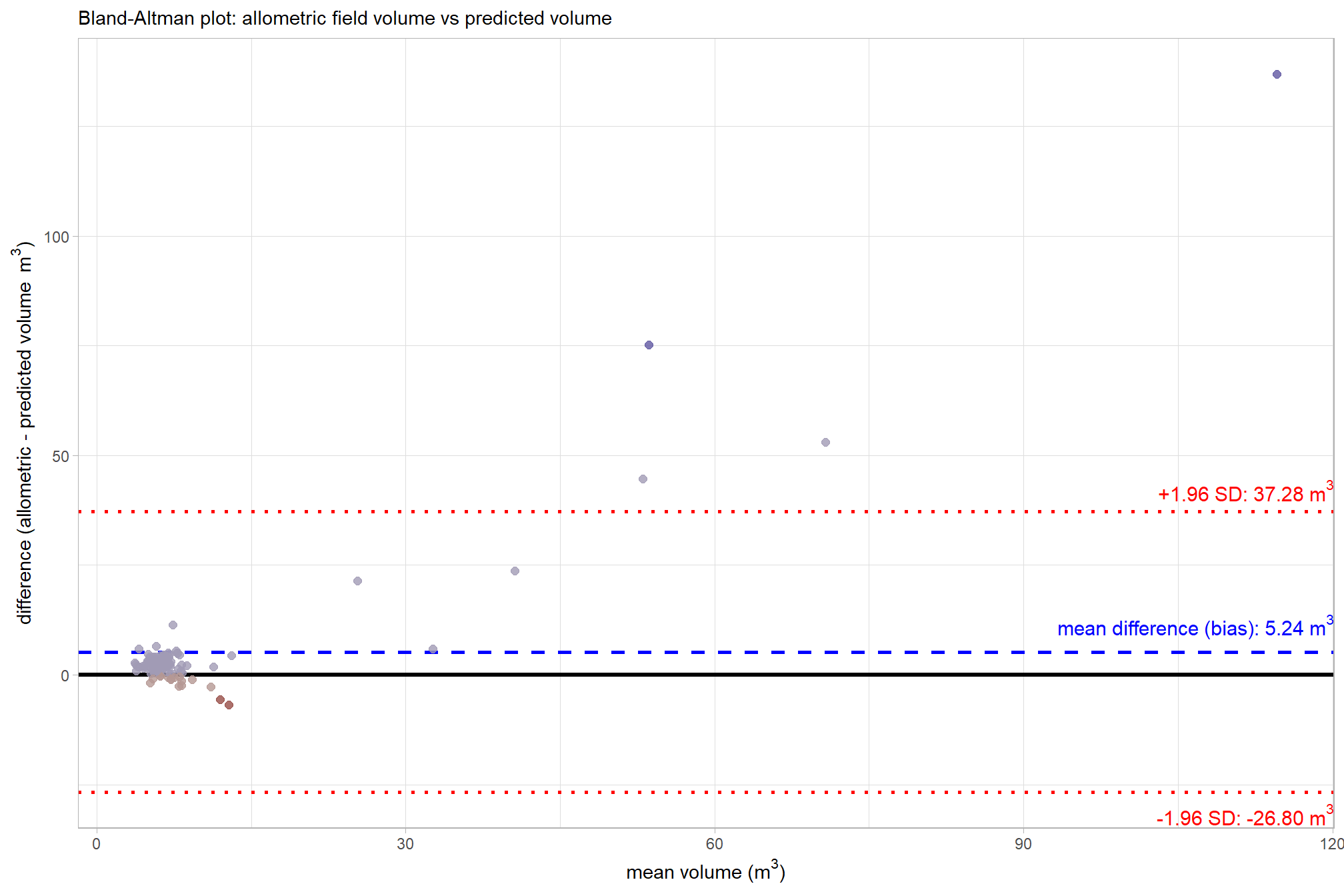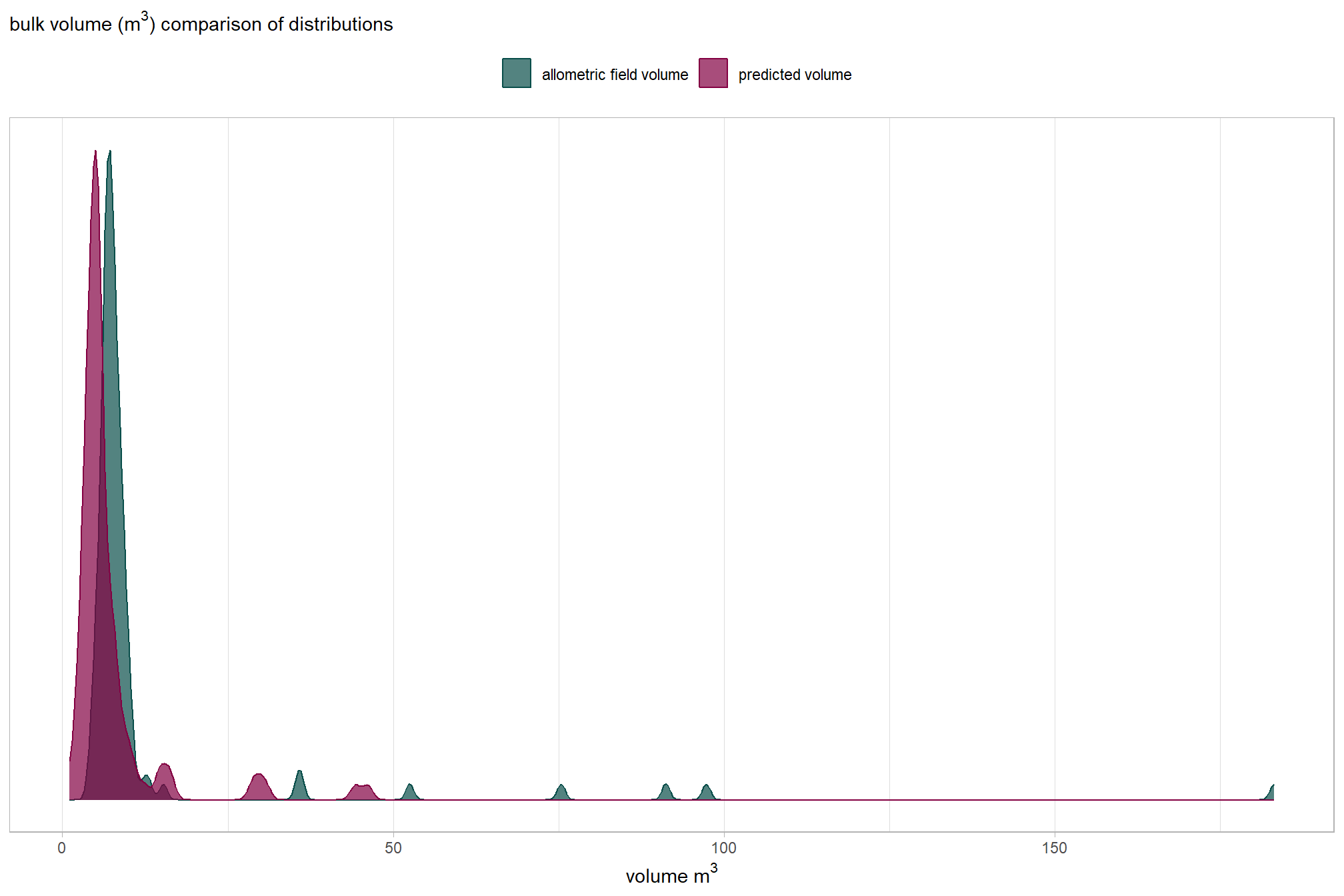 Visual inspection of the unfiltered CHM (note the CHM scale range) within the footprint of these volume outliers confirms that the field-measured values are misaligned with the CHM profile by at least 1m for some of the most extreme outliers, supporting the theory that the significant volume and height differences observed are magnified by potentially incorrect field measurements.