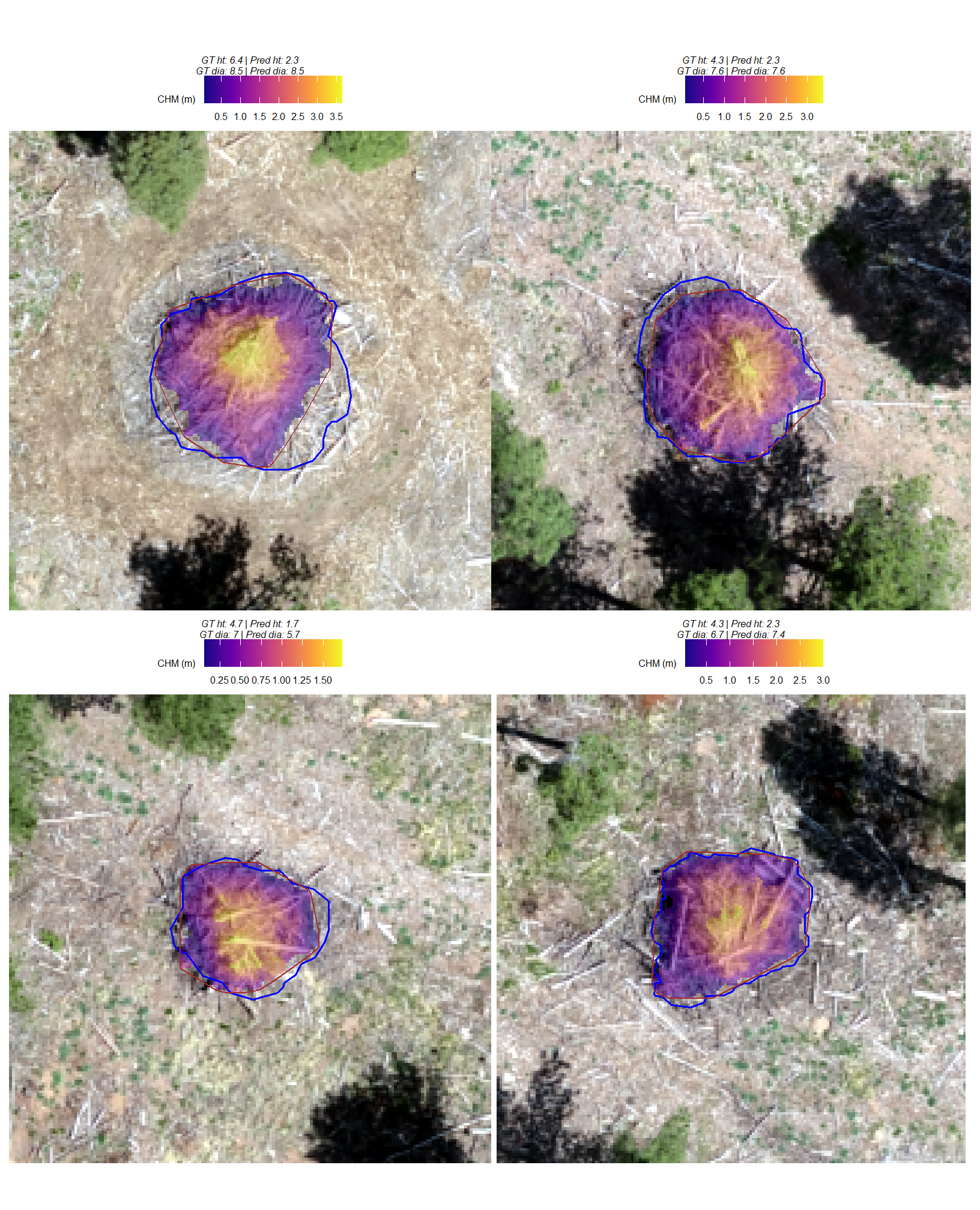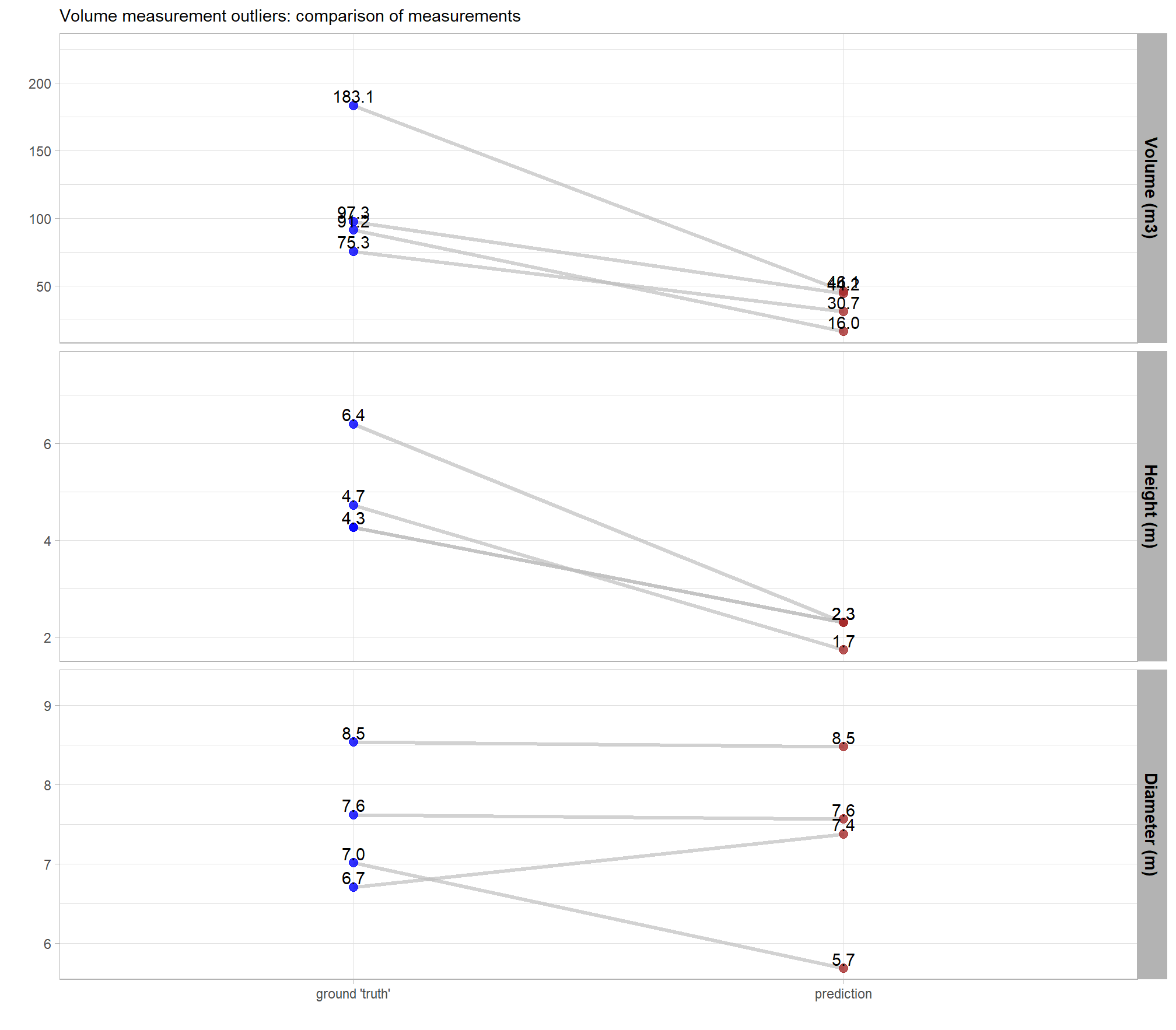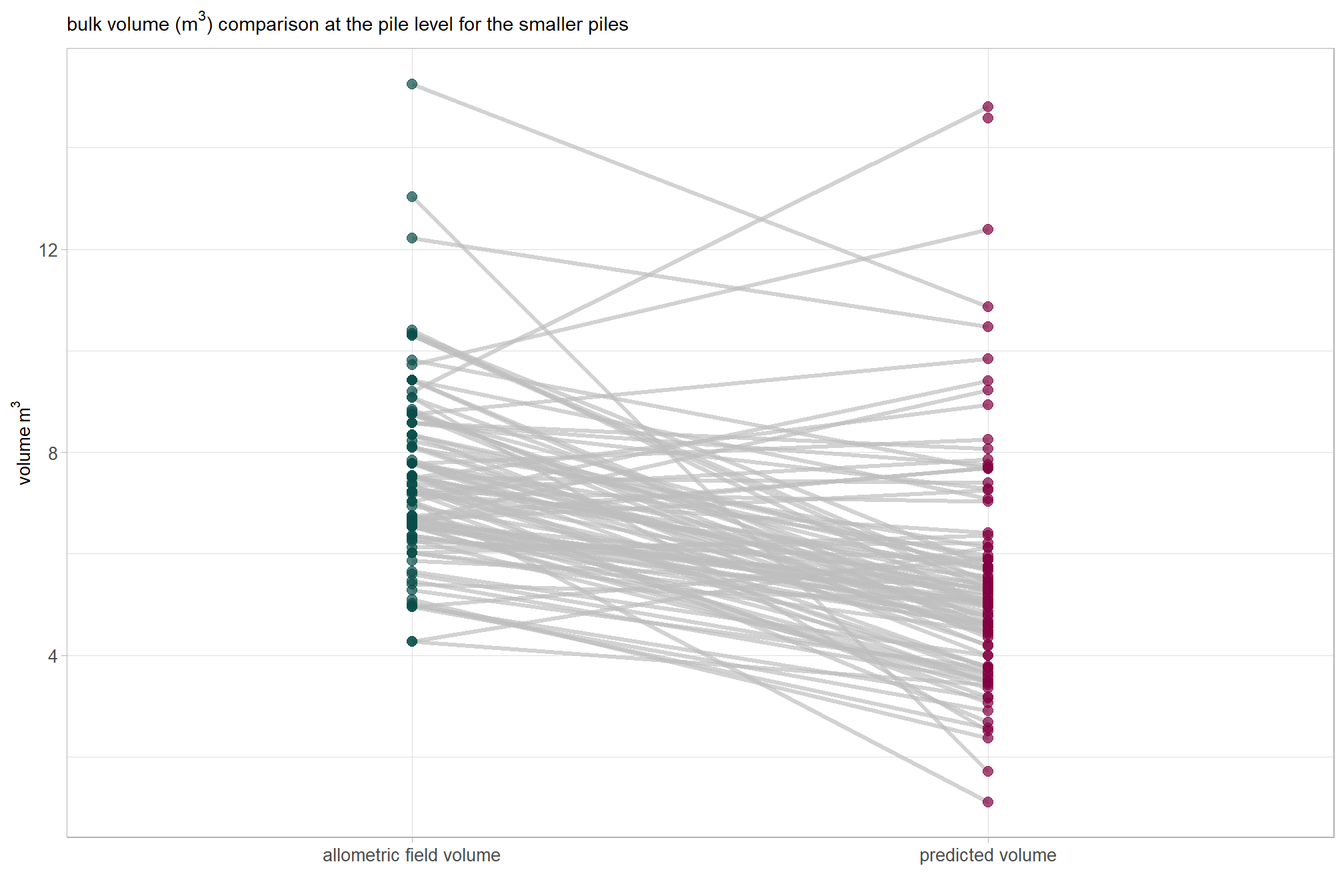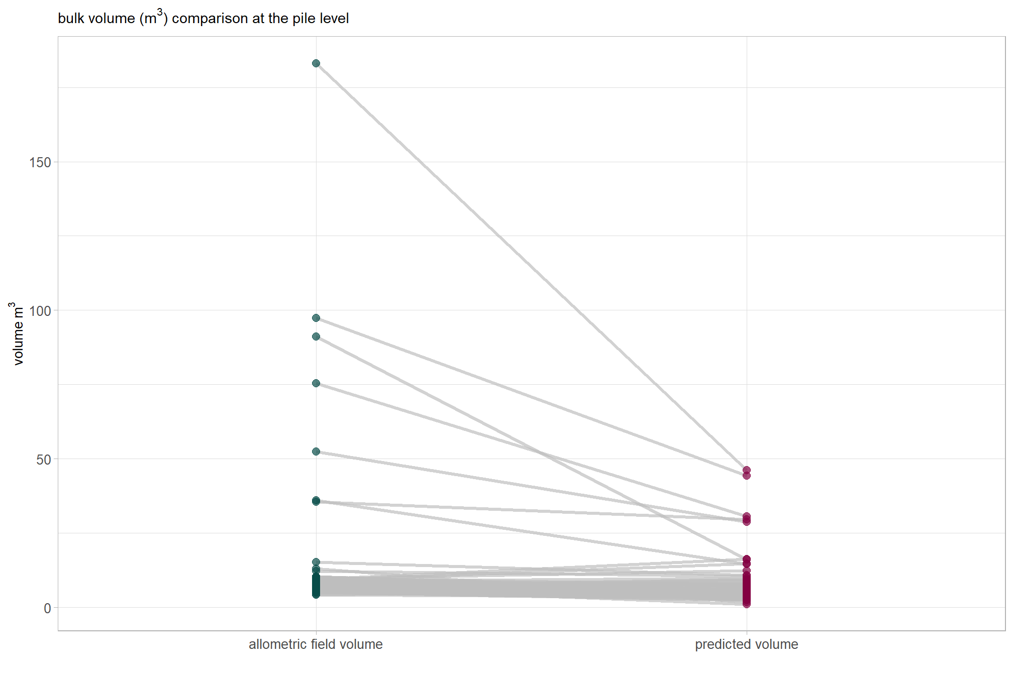 After filtering for expected height, our detection methodology calculates the predicted height as the maximum CHM cell value within the expected height range (i.e. up to the max_ht_m setting), which effectively caps any actual height values above this threshold. For our training data, we assumed a maximum height of 2.30m. The field data contains heights up to 6.40m for these volume outliers, which would only be expected of the largest machine piles. In these extreme cases, the significant volume difference observed in the outliers is magnified by both potentially incorrect field measurements and the systematic capping of the predicted height.