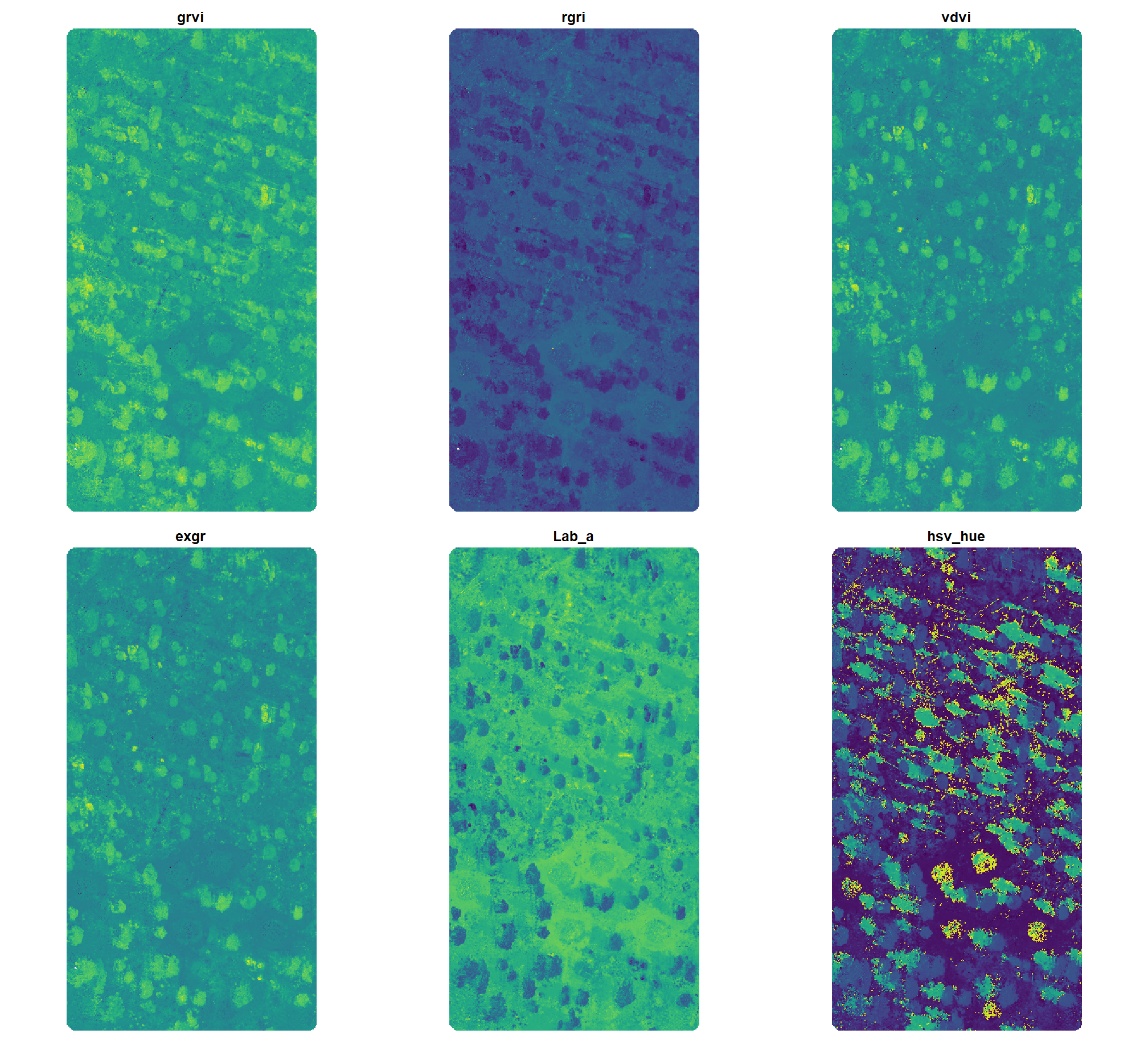 | Visible-band Difference Index | VDVI | Index for extracting vegetation from complex backgrounds | \(\frac{2G - R - B}{2G + R + B}\) | -1 to 1 |