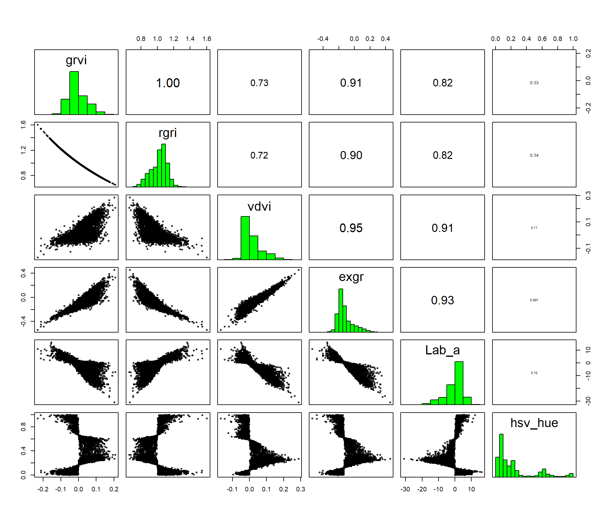 | Excess Green-minus-Red | ExGR | Linear index for discriminating plants from soil/background | \(3g - 2.4r - b\) | -3.4 to 3 |