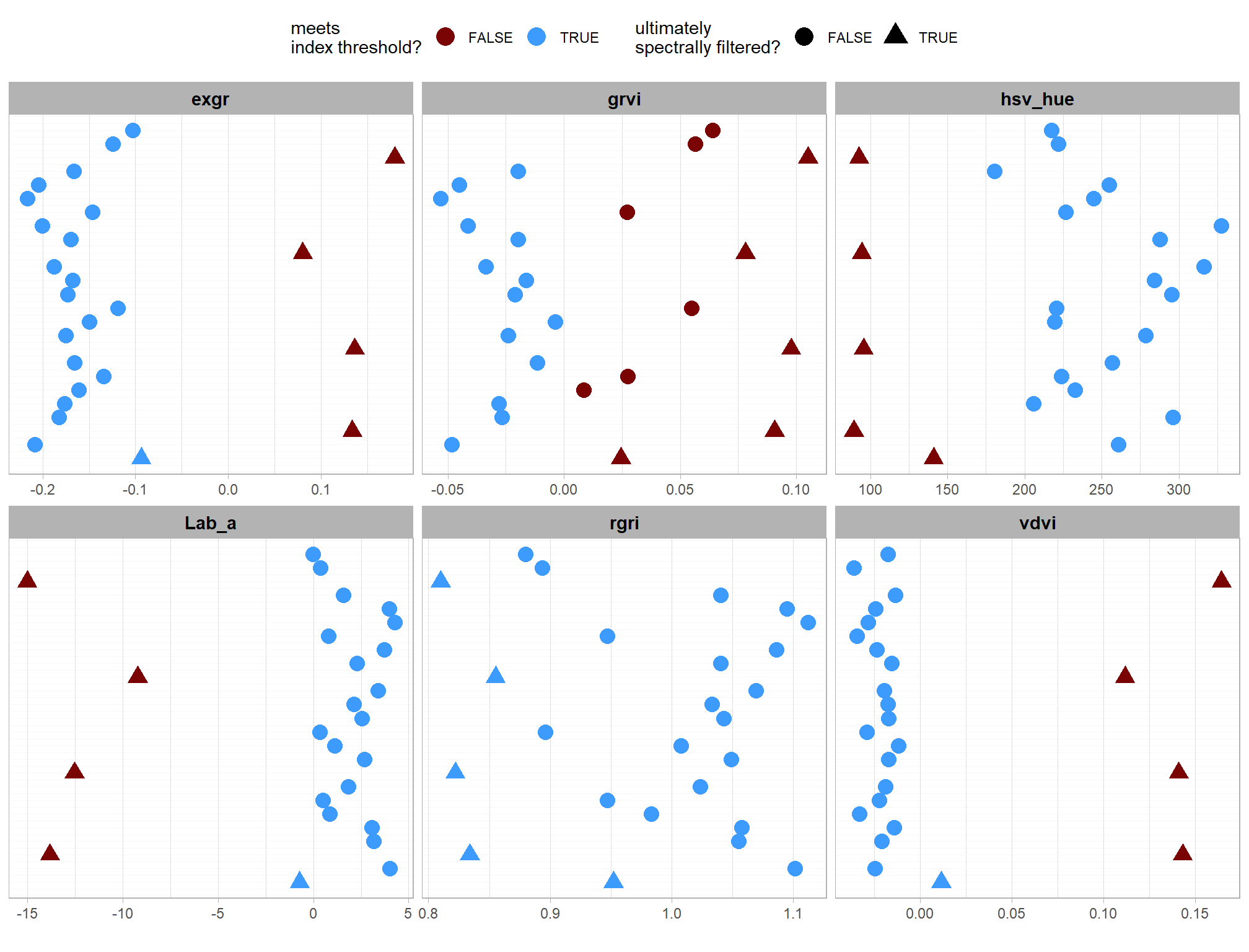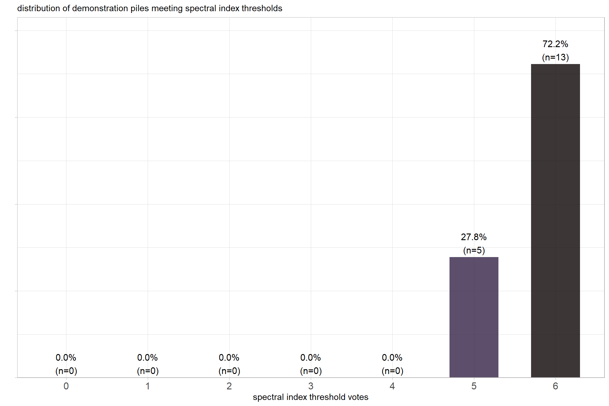 Rather than relying on a single spectral metric, our method employs a “voting” system where all six indices contribute to candidate evaluation. Integrating six distinct index-threshold pairs determined independently by different researchers across diverse sensors and vegetation types is more stable than relying on any single index or study a an ensemble approach minimizes the potential error or limitations inherent in a single identified threshold. This ensemble approach provides a framework that allows users to weight the spectral data by requiring anywhere from 0 to 6 thresholds to be met for a candidate pile to be retained. Setting the requirement to zero relies exclusively on the structural detection, while higher values place progressively more weight on spectral confirmation.