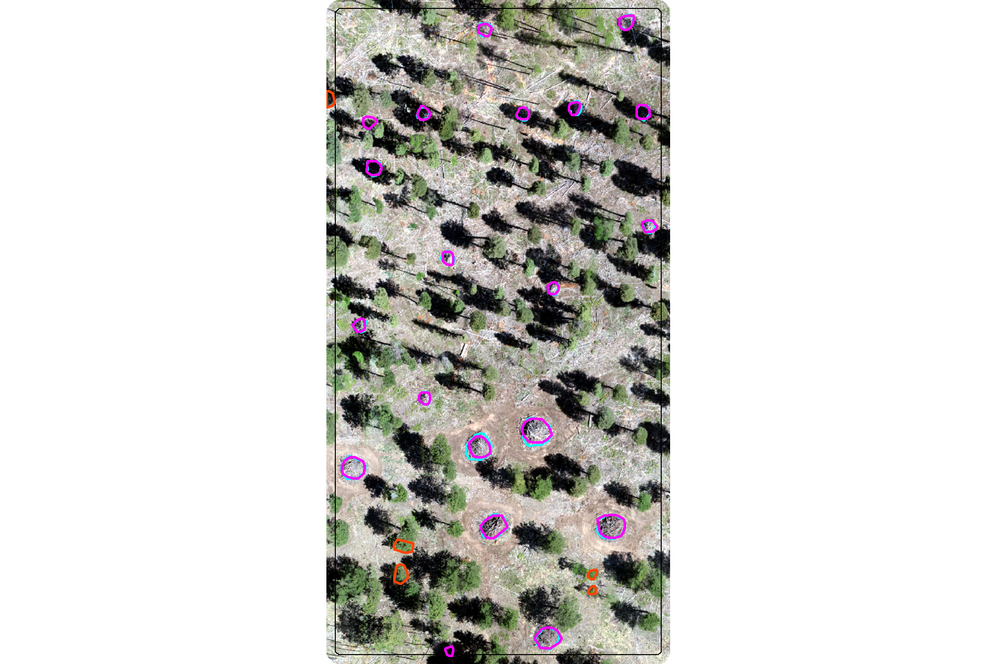 in this demonsration area, the spectral filtering of our data fusion approach successfully filtered the structurally detected candidate piles that were clearly lower parts of trees (clearly green in the RGB). however, the spectral filtering failed to remove some false positive predictions that were shadowed in the RGB imagery. a positive result, though, was that the spectral filtering stage did not remove any true positive predictions.